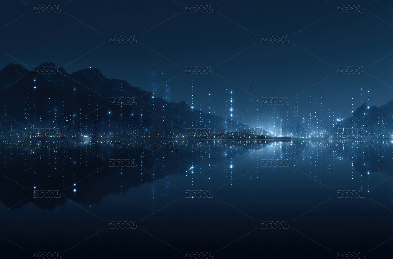 夜湖山影与光点倒影