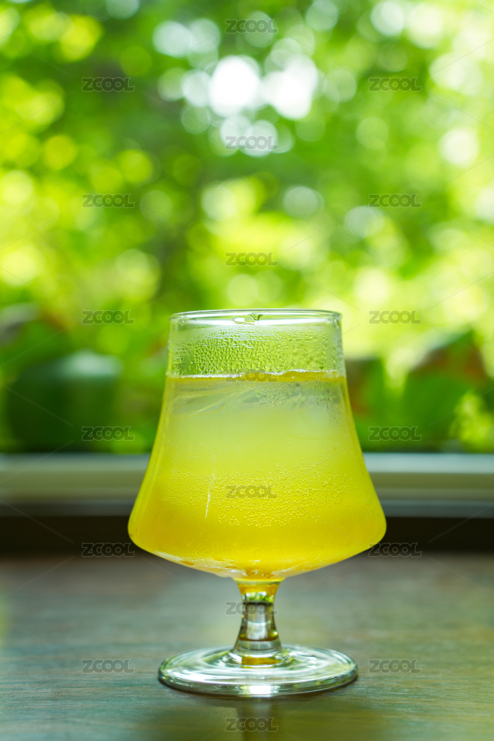 果汁,玻璃杯,黄色饮品,冰块,夏日,冰饮,绿色背景,清凉,饮品特写,木桌