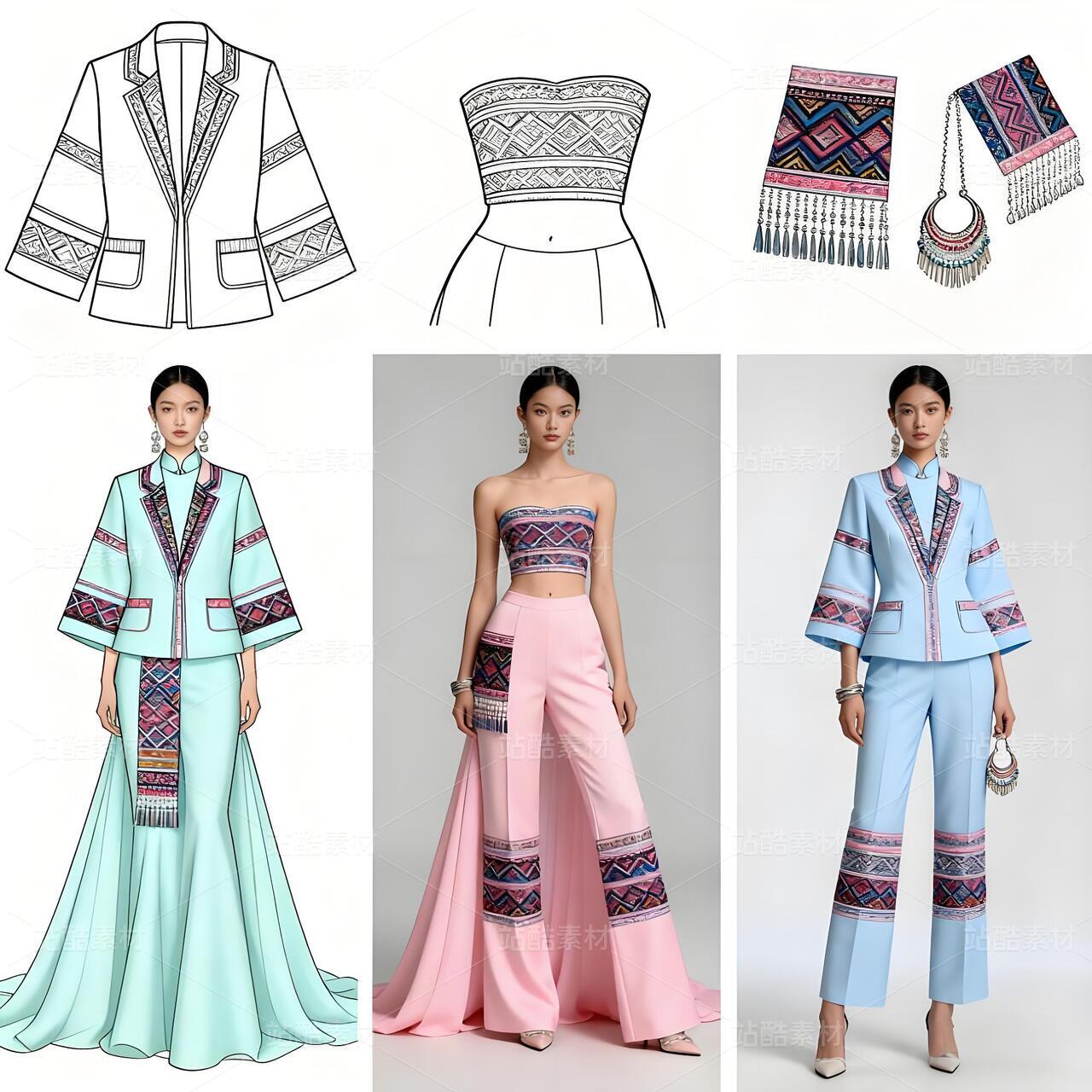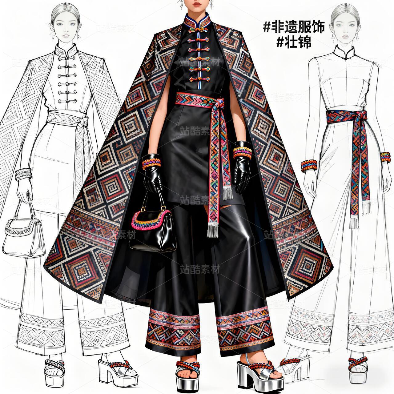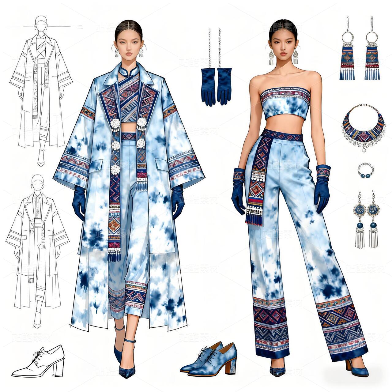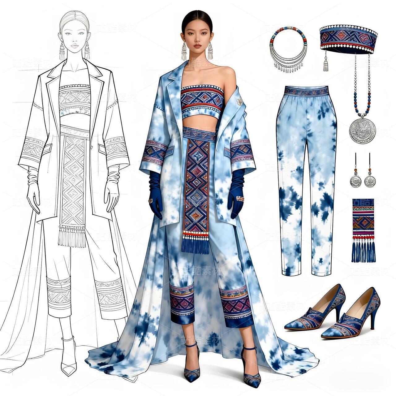 当千年壮锦遇见现代高定,非遗在针线间重获新生。这件浅蓝扎染礼服以流畅剪裁勾勒东方风骨,衣身缀满壮锦特有的菱形纹与云雷纹,寓意吉祥。外套廓形利落,与飘逸裙摆形成张力;手套与裤装延续图腾刺绣,银饰腰封轻束,踏一双改良翘头绣鞋。扎染的氤氲蓝如漓江晨雾,衬得壮锦金线愈发璀璨。传统与时尚在此和解——非遗不再是博物馆的标本,而是可穿着的诗意,是行走的文化自信。