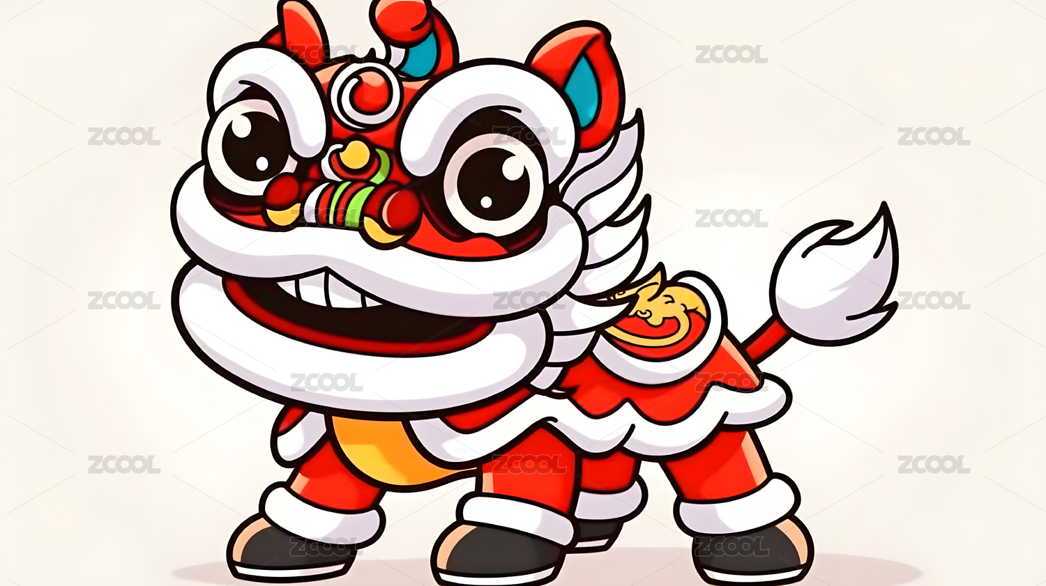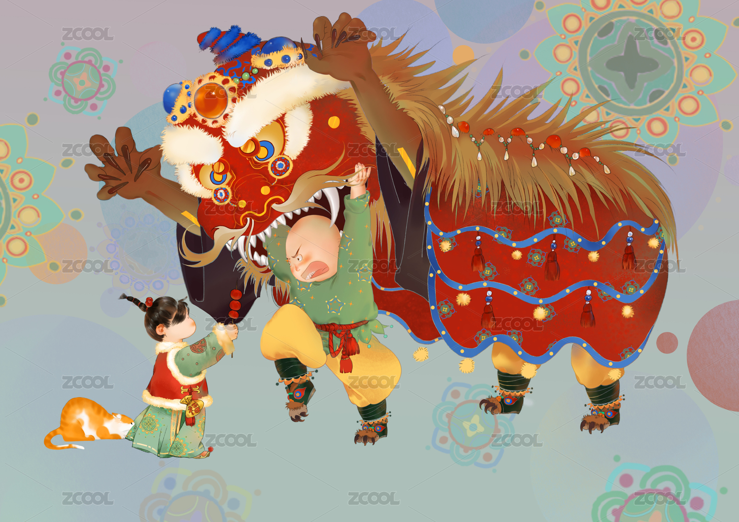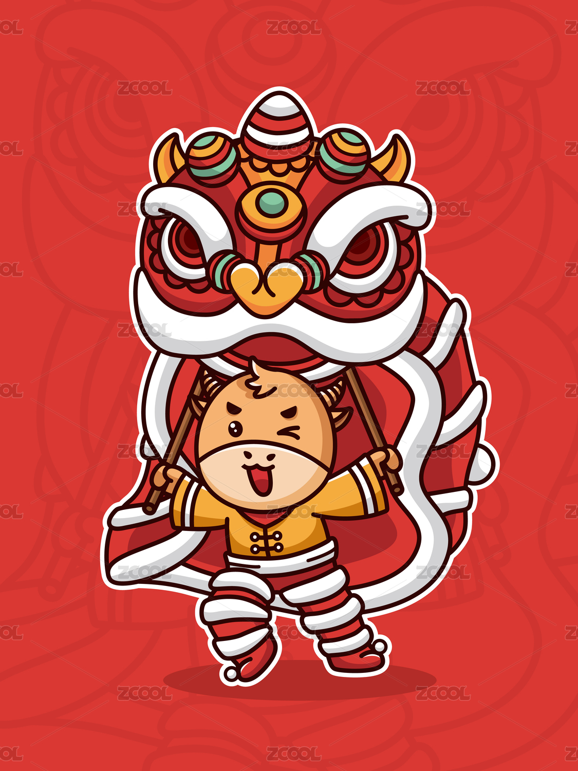 牛在舞狮来庆祝新年2021年牛年到来插画