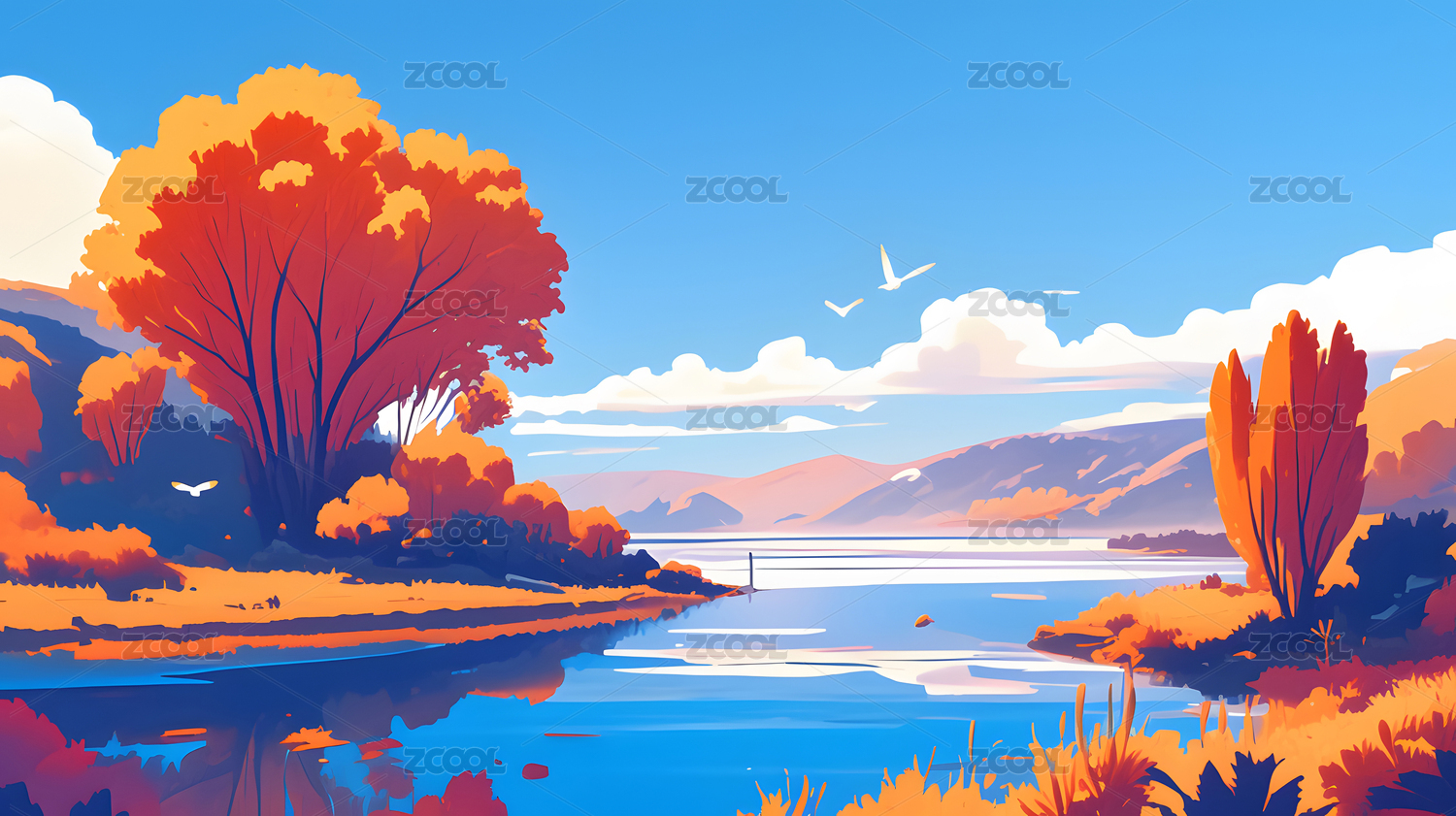 湖泊,山水,树木,山峦,天空,白云,水面,倒影,自然景观,风景
