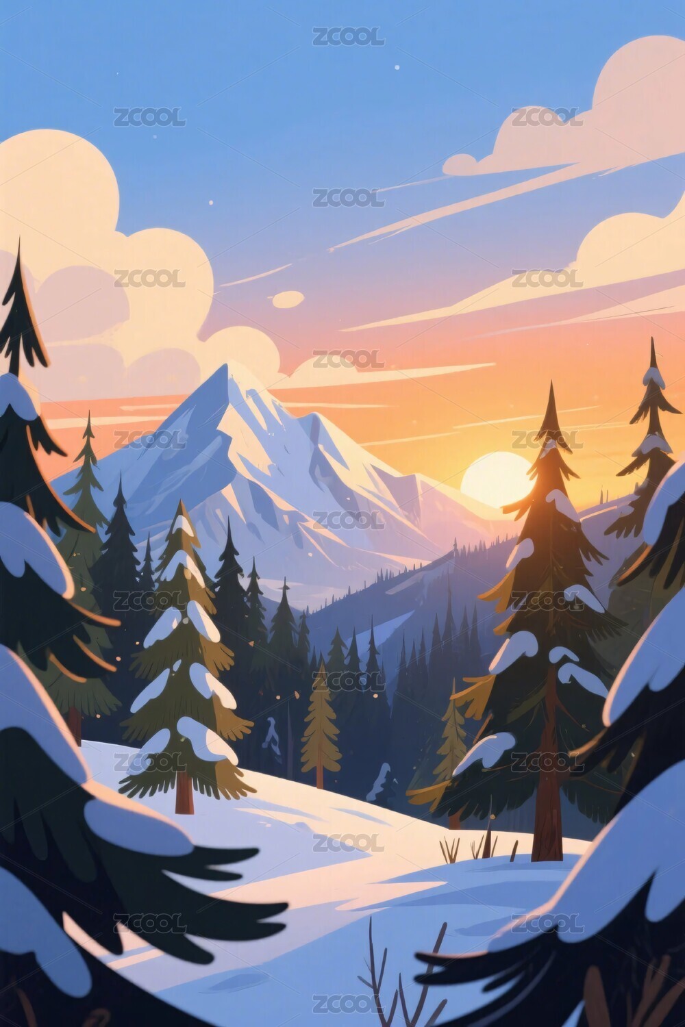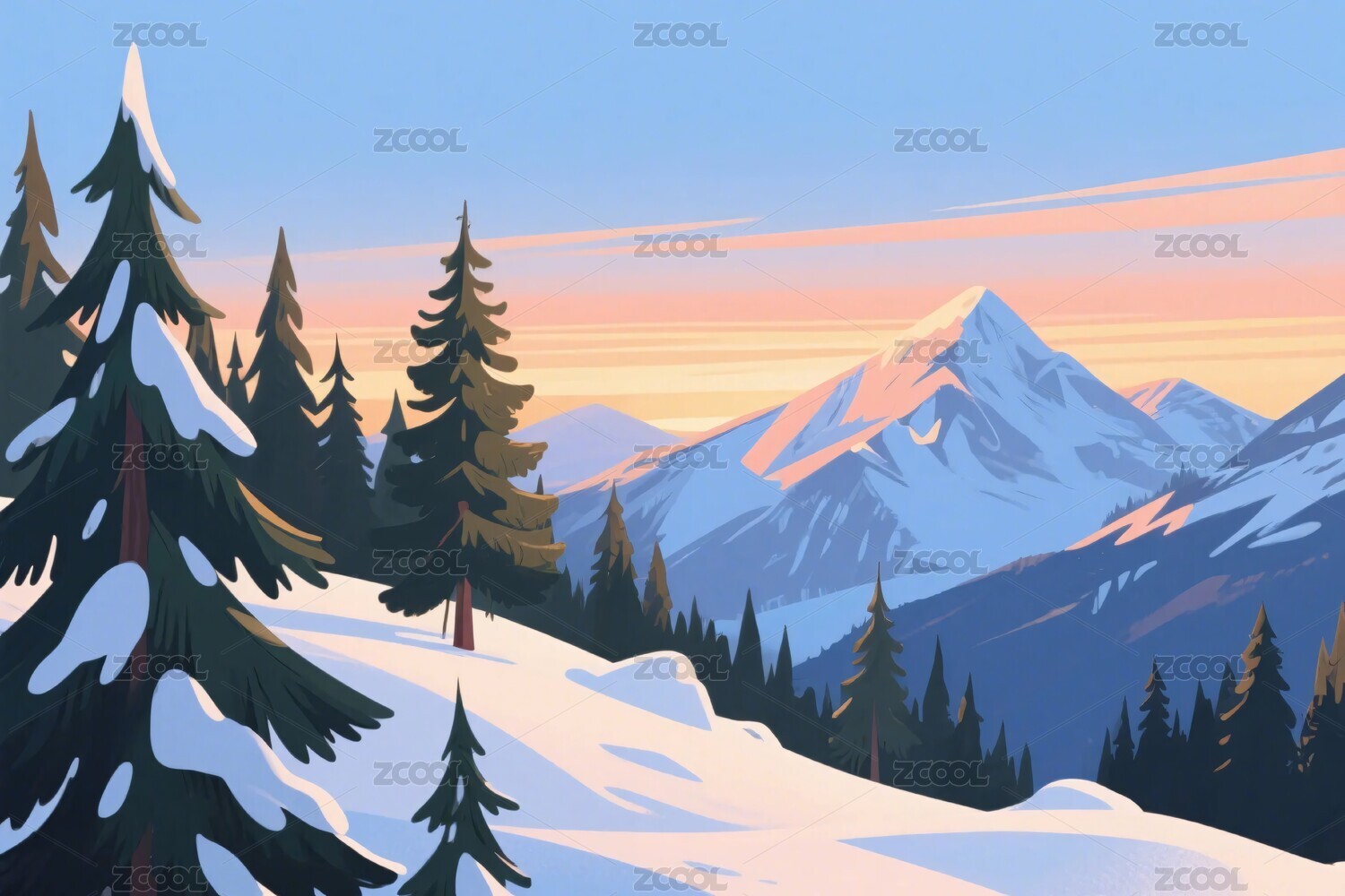 雪山,森林,雪景,插画,冬季,风景,自然,雪地,松树,山脉