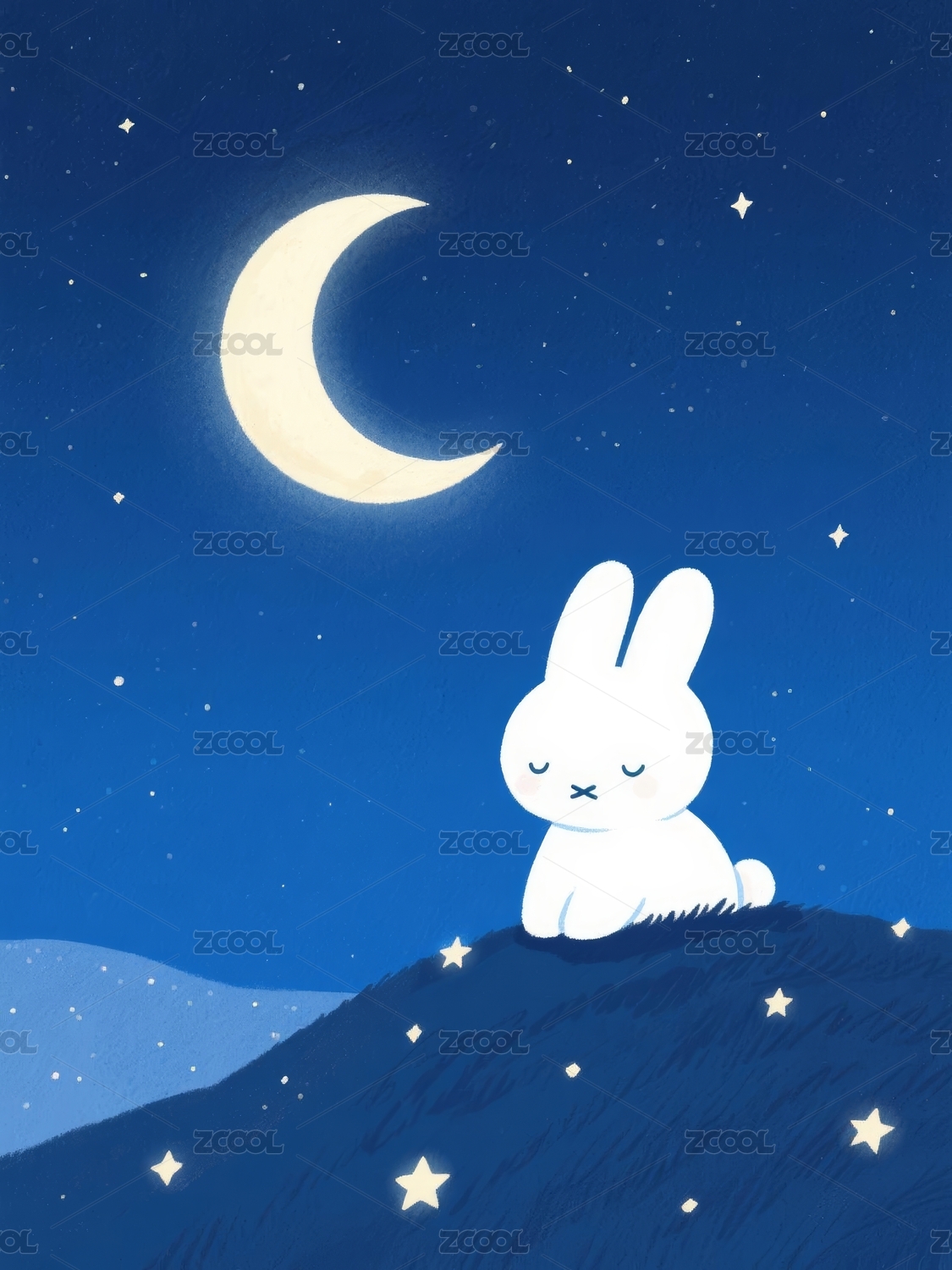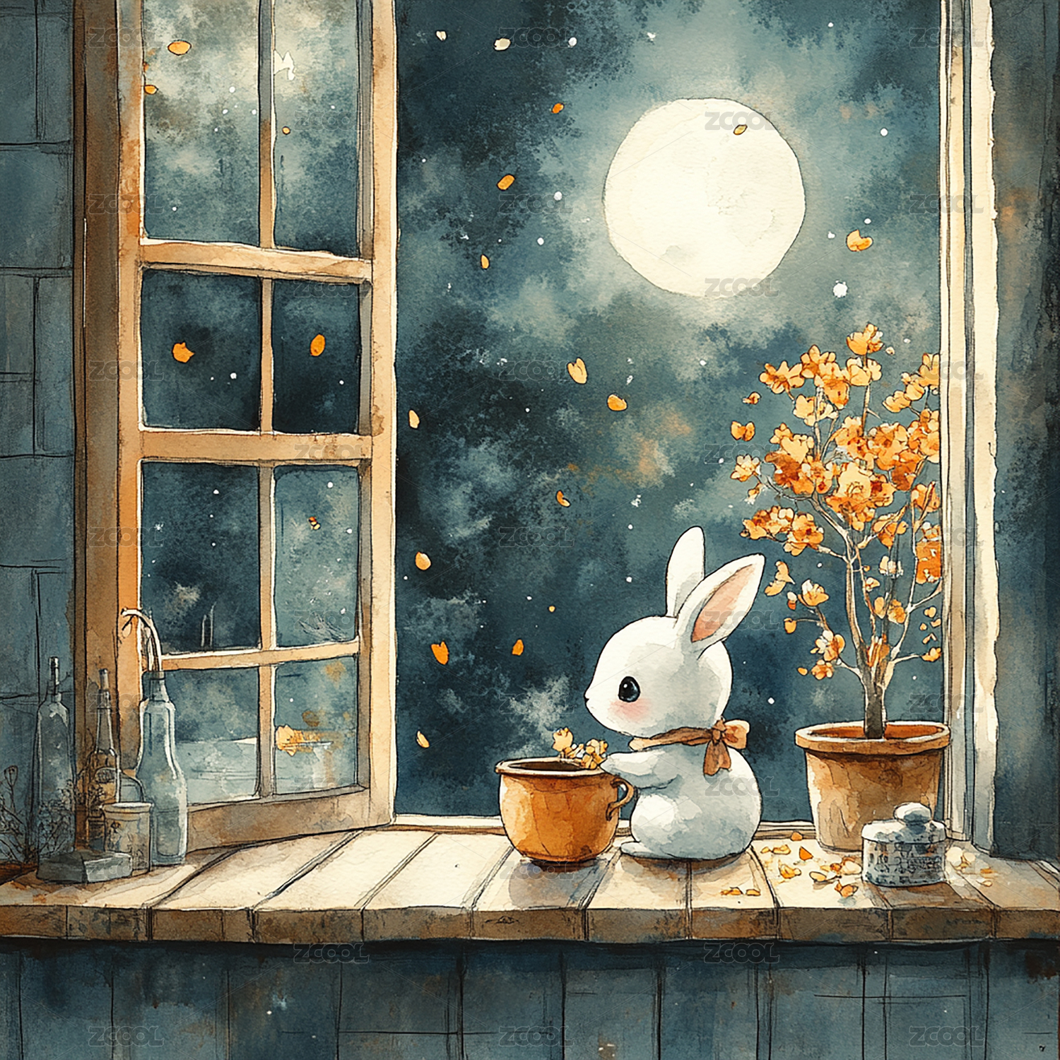 兔子,月亮,窗户,夜景,插画,卡通,窗台,夜空,月亮图,窗户饰