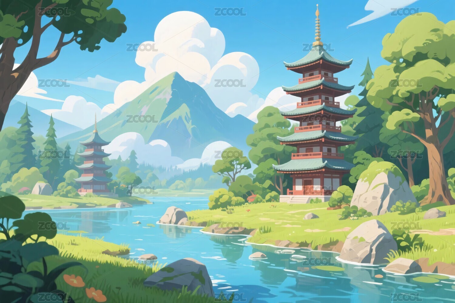 古建筑,河流,树木,山水,蓝天,卡通,插画,风景,矢量,模板