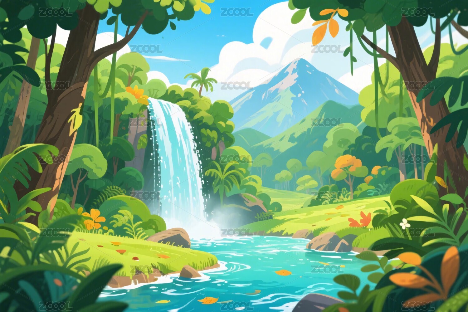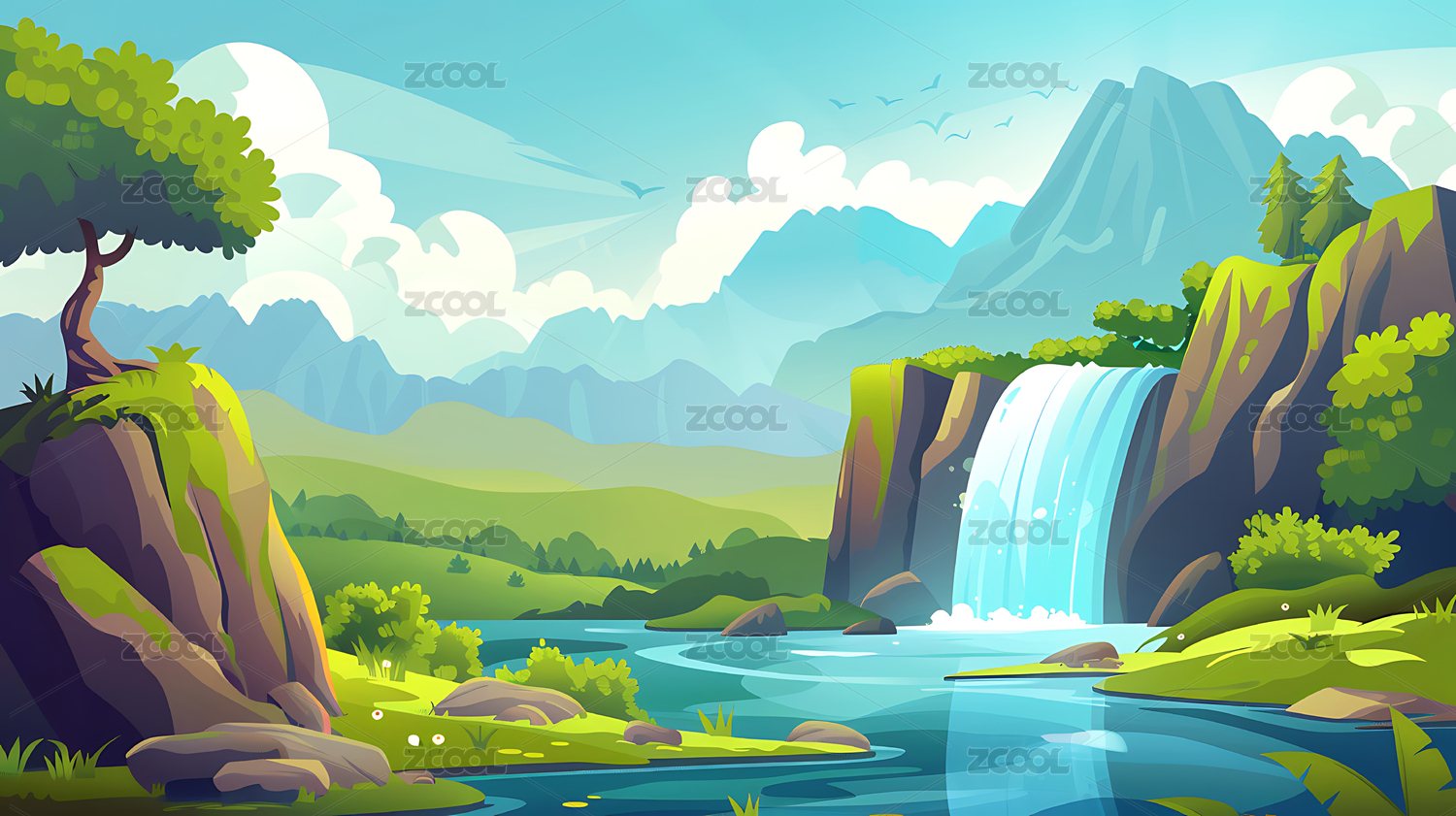 瀑布,森林,山水,河流,树木,植被,自然风景,插画,矢量,卡通