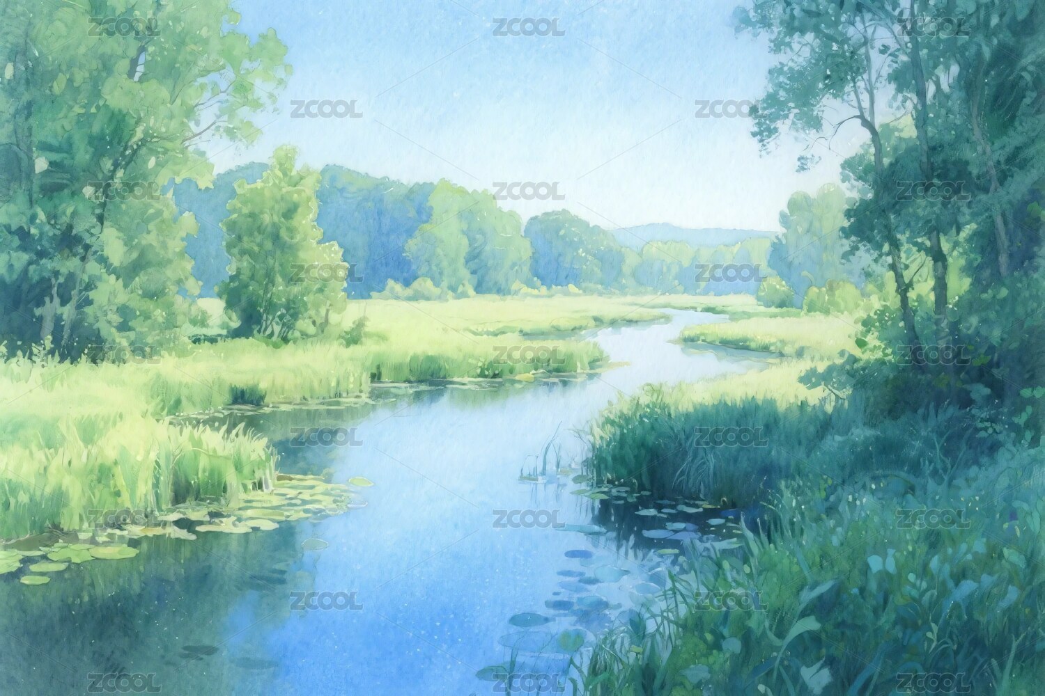 水彩自然风景河流
