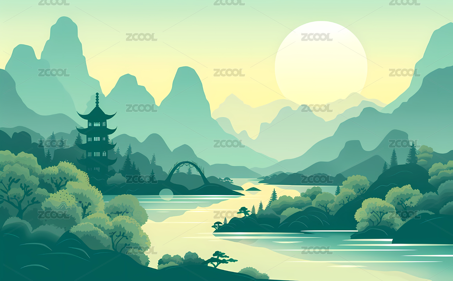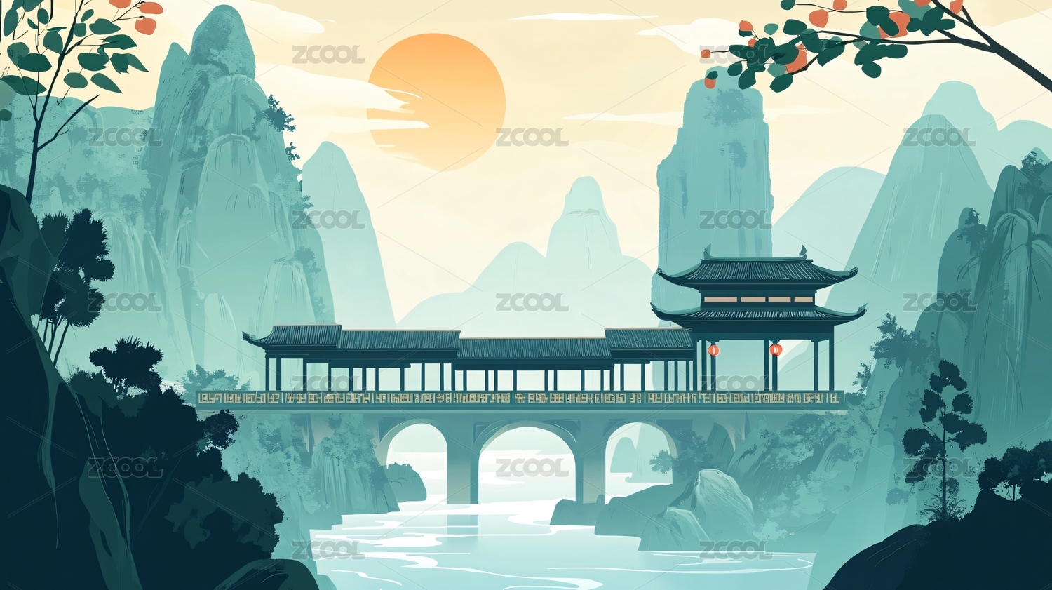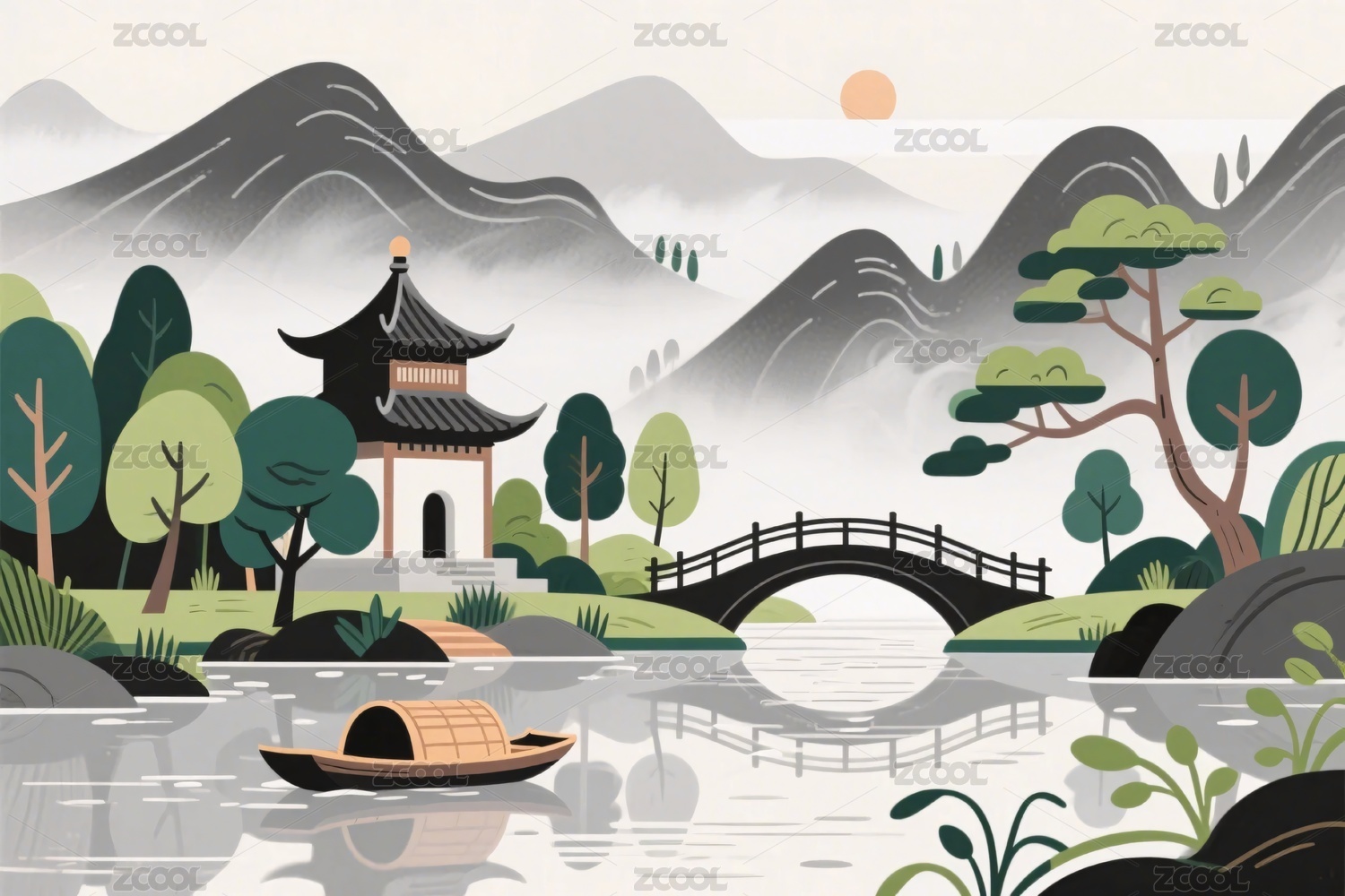山水,河流,小船,古桥,古建筑,树木,山峦,古塔,水墨,插画