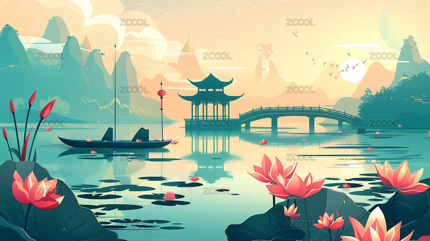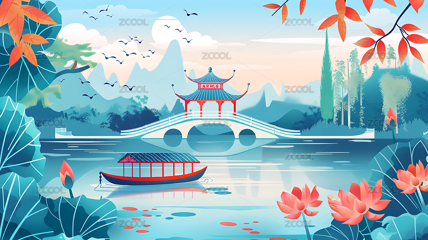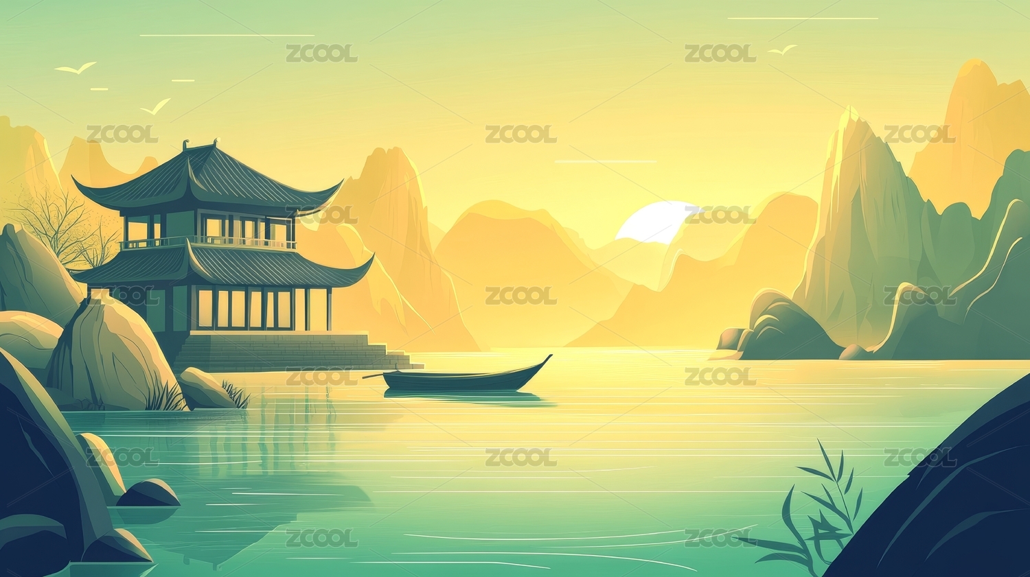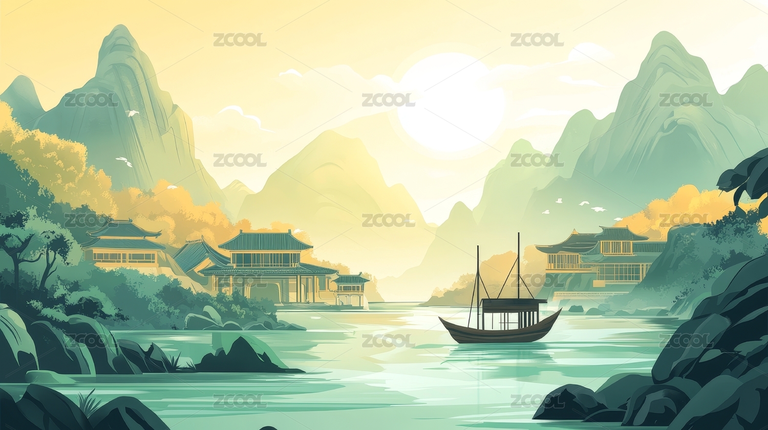山水,河流,小船,古桥,古建筑,树木,山峦,古塔,水墨,插画