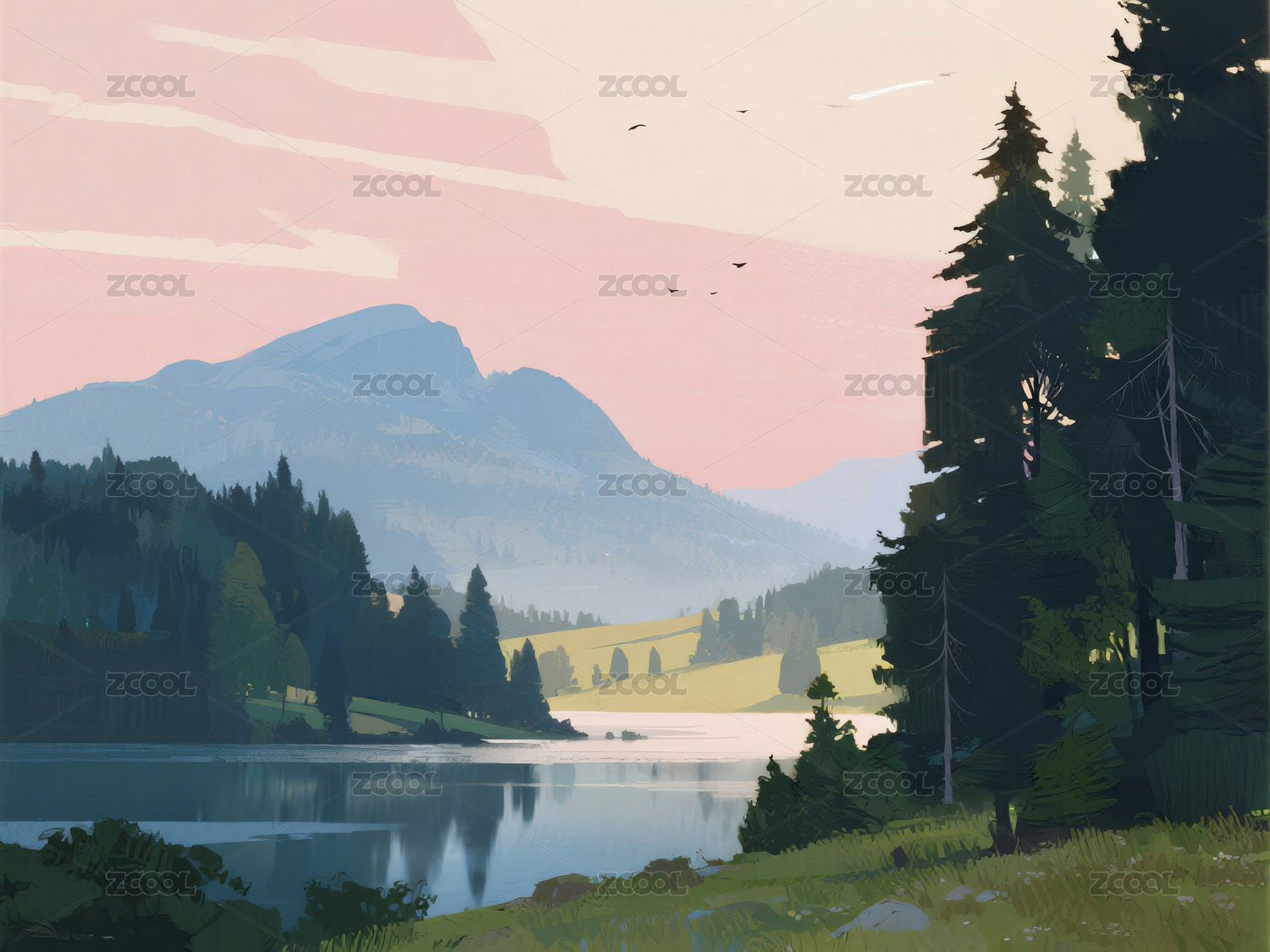 湖泊,山峰,森林,树木,风景,自然,山水,插画,矢量,模板