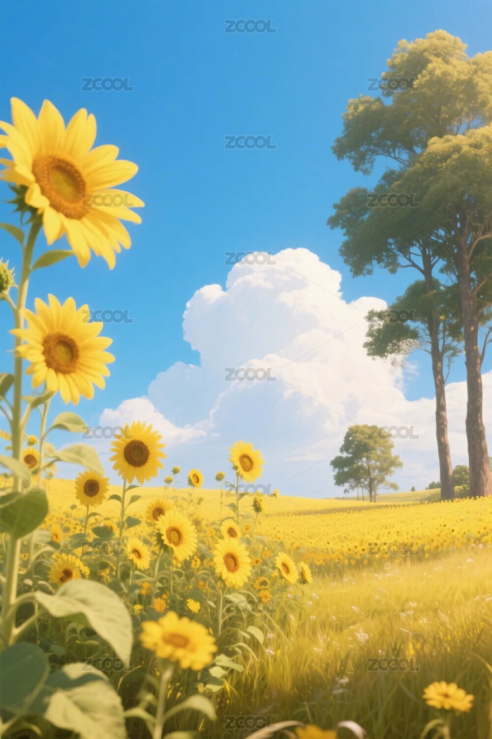 向日葵,田野,蓝天,白云,树木,自然,风景,田园,插画,素材