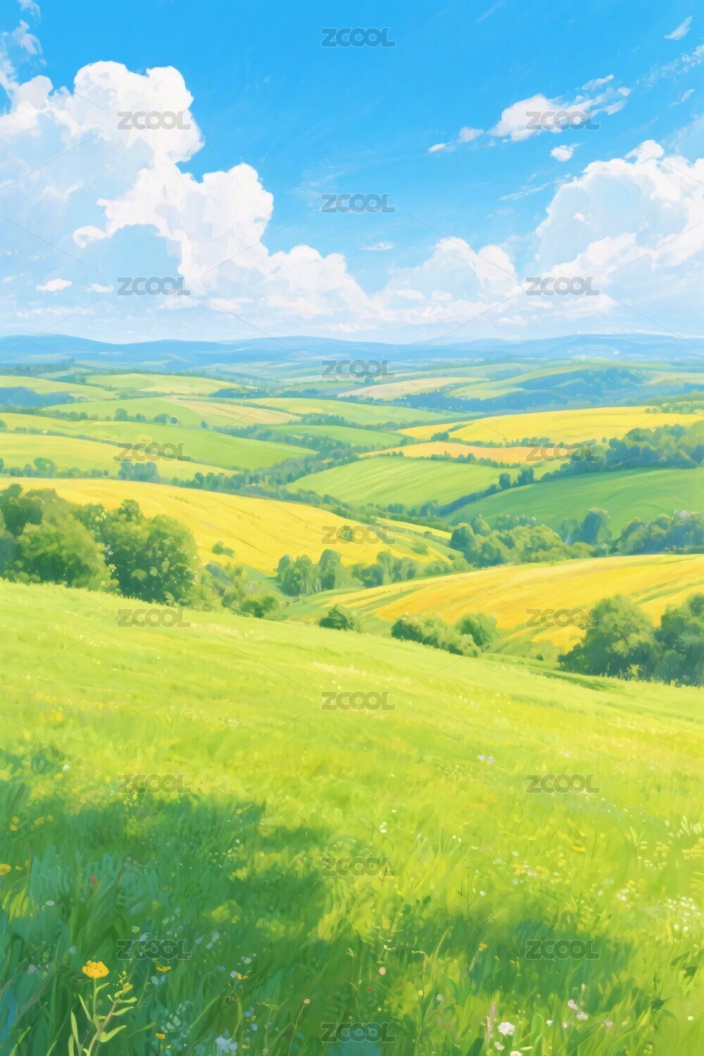 风景,草地,山水,蓝天,白云,山脉,绿色,自然,风景画,插画