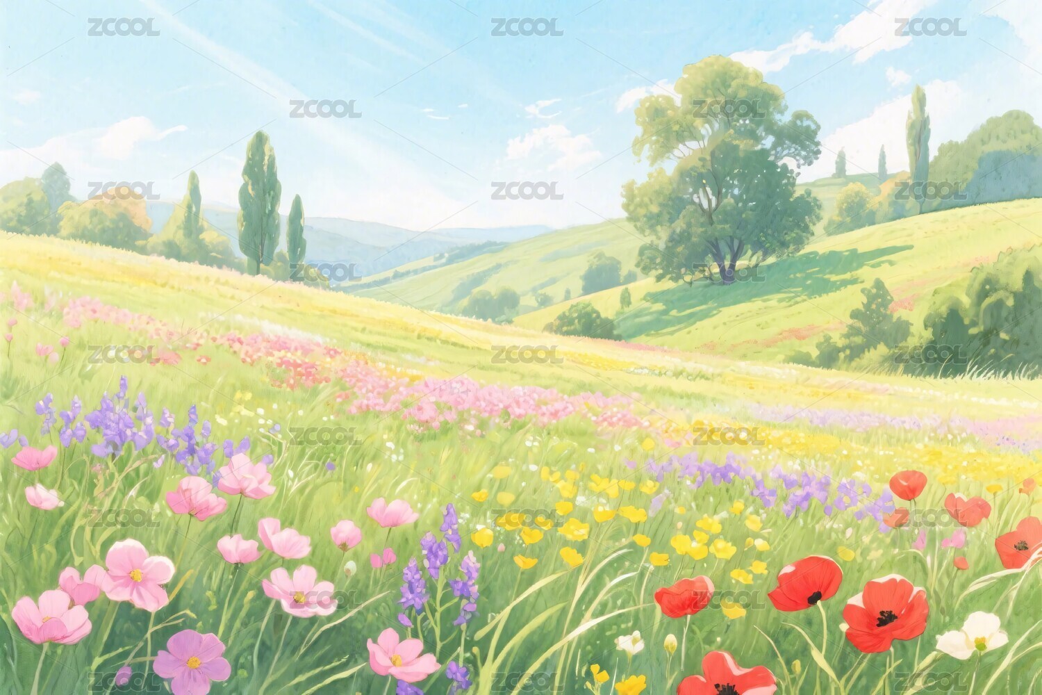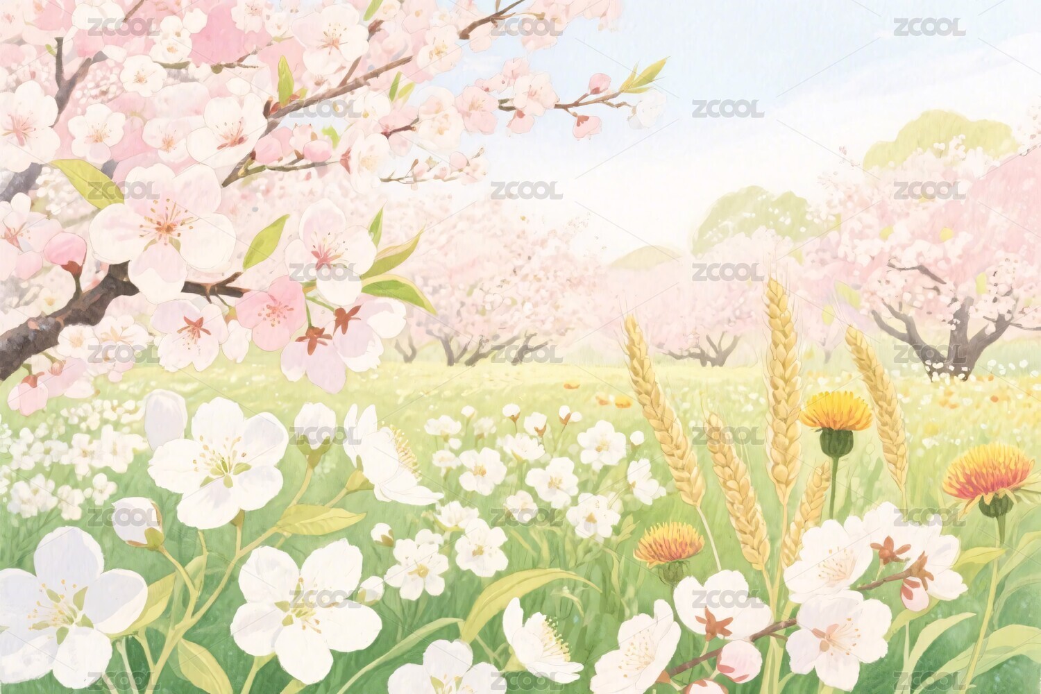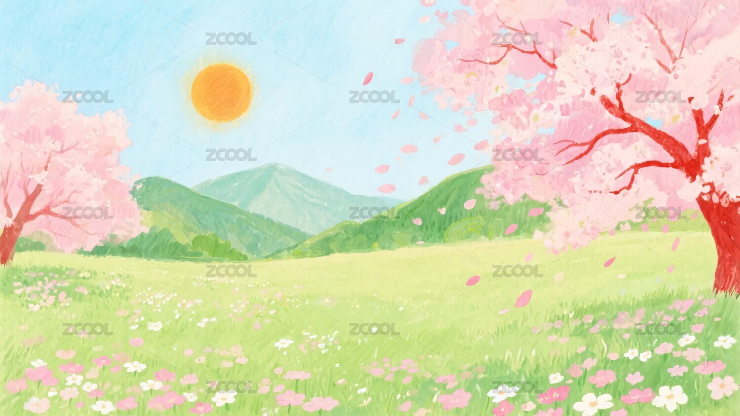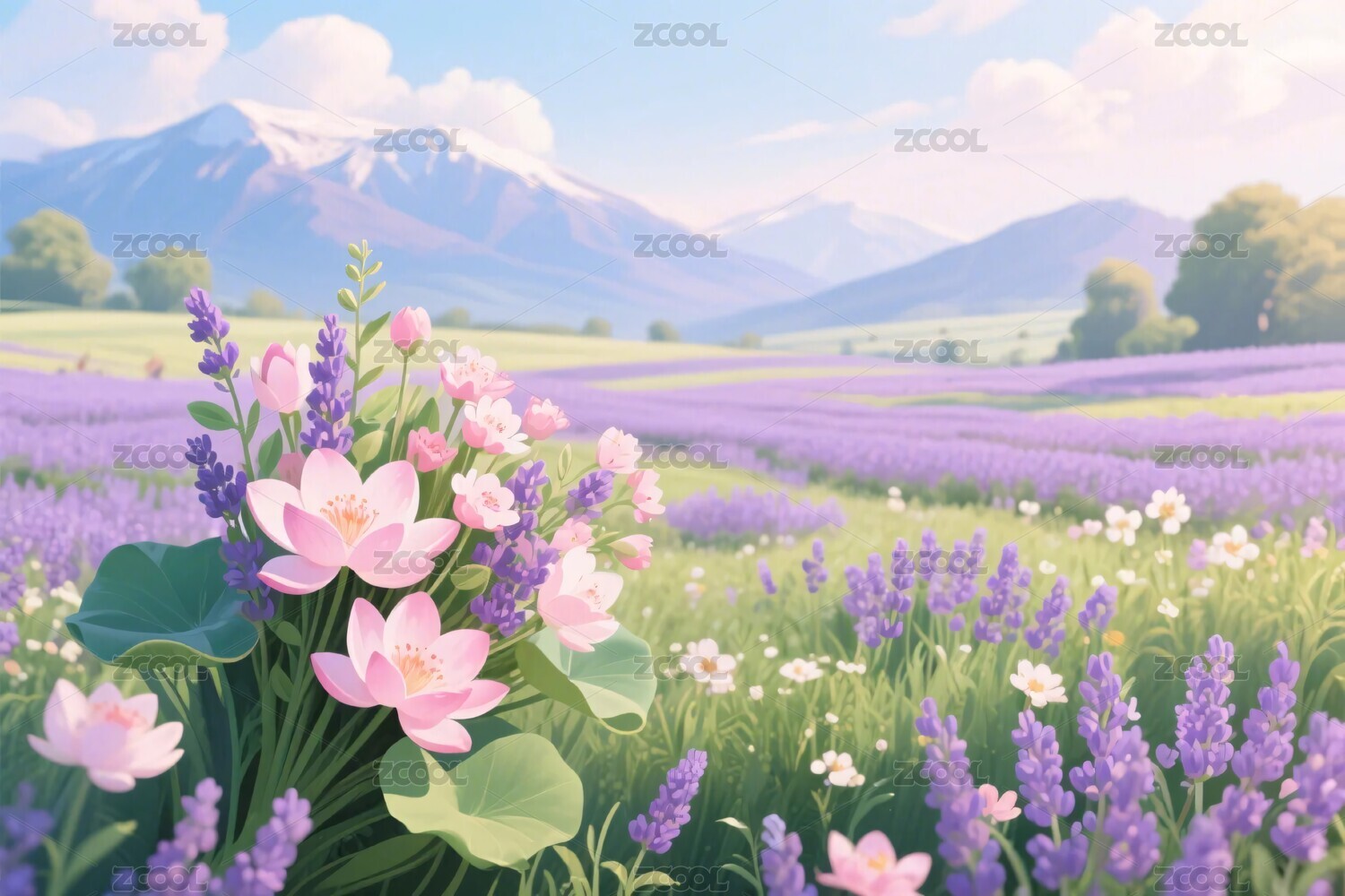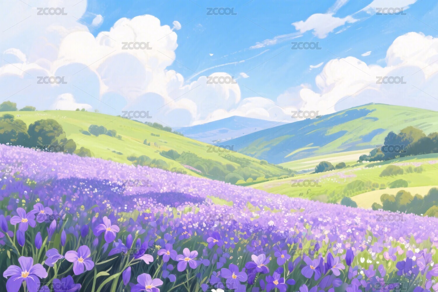 樱花,紫色花,花田,远山,蓝天,春景,插画,自然,花卉,风景