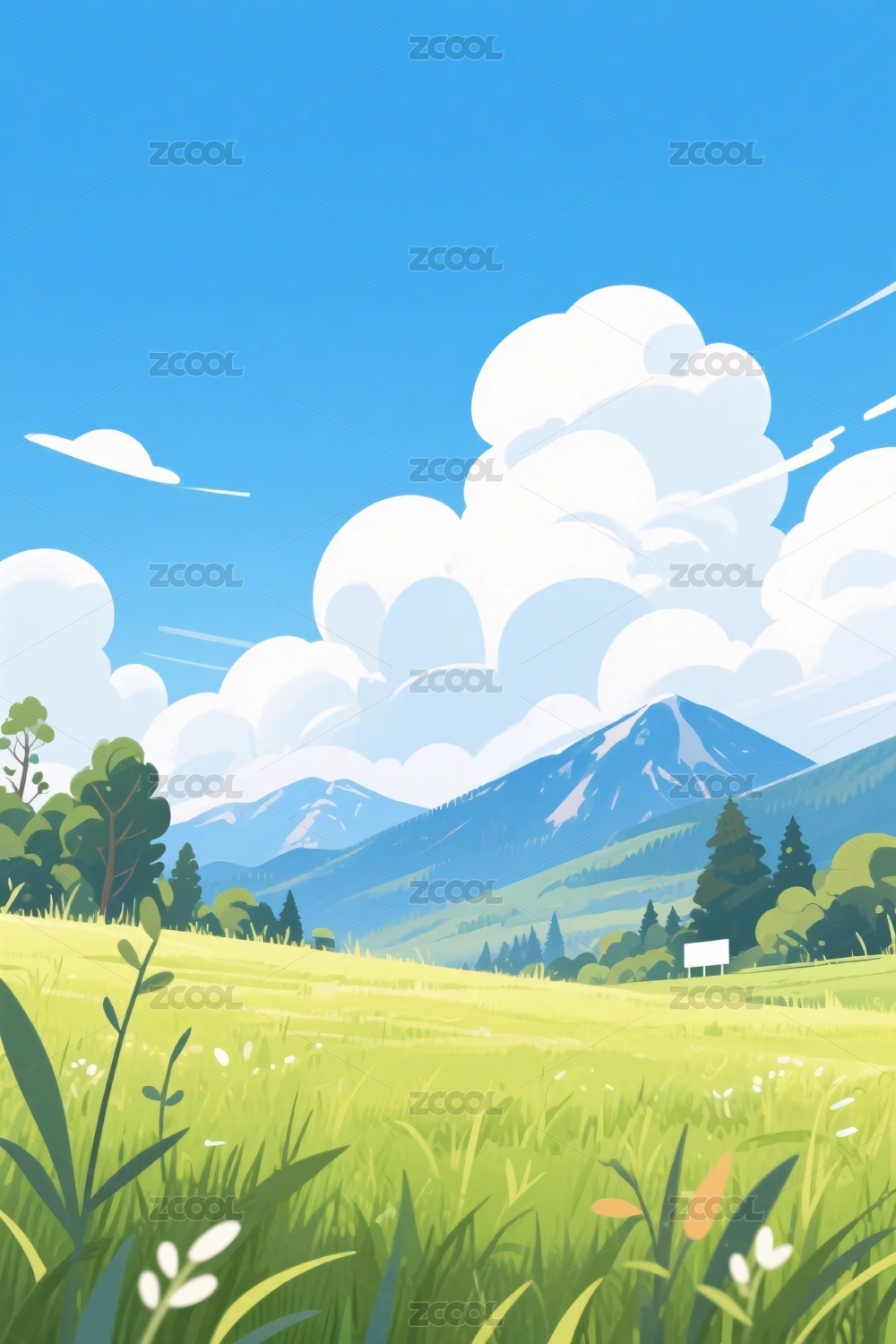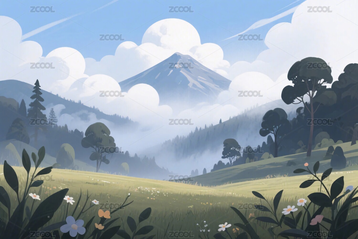 山脉,天空,云朵,树木,草地,风景,插画,自然,清新,风景画