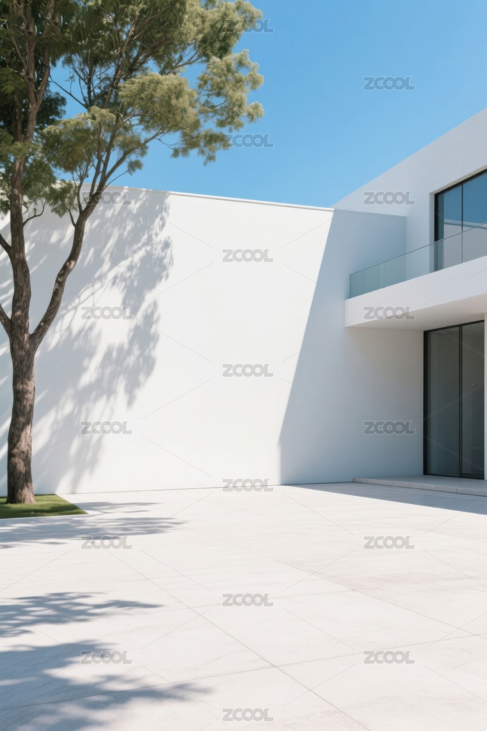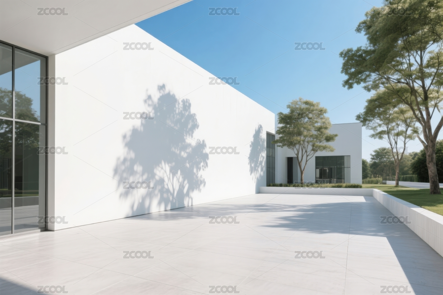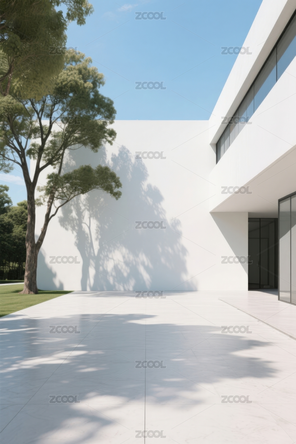 极简庭院白色建筑与树影