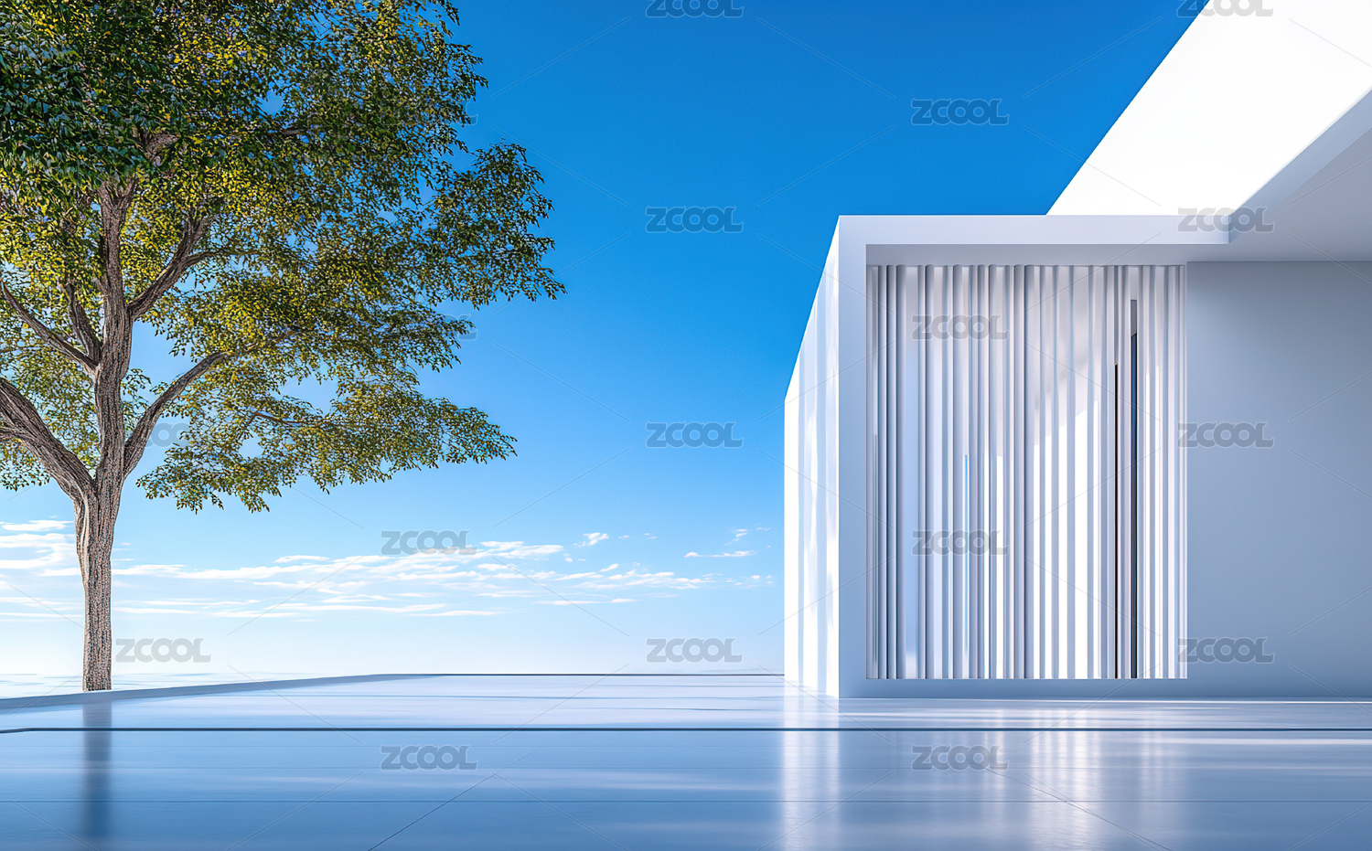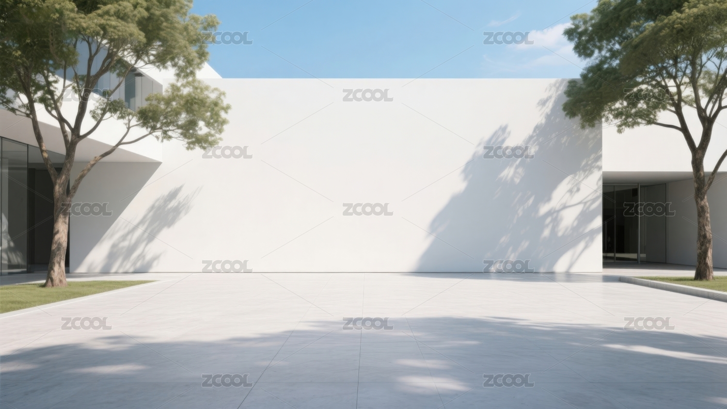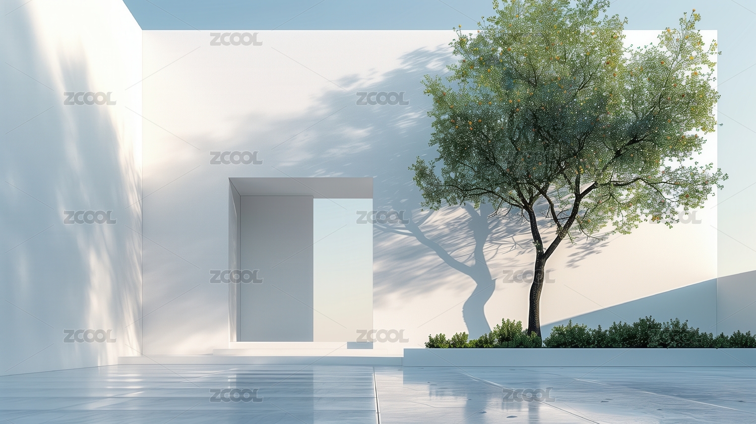 极简庭院白色建筑与树影