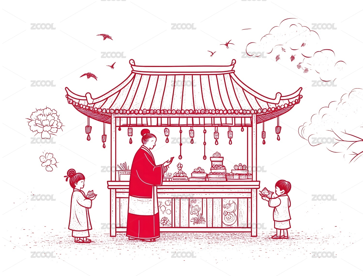 国风腊八节古代粥摊场景线条风格插画