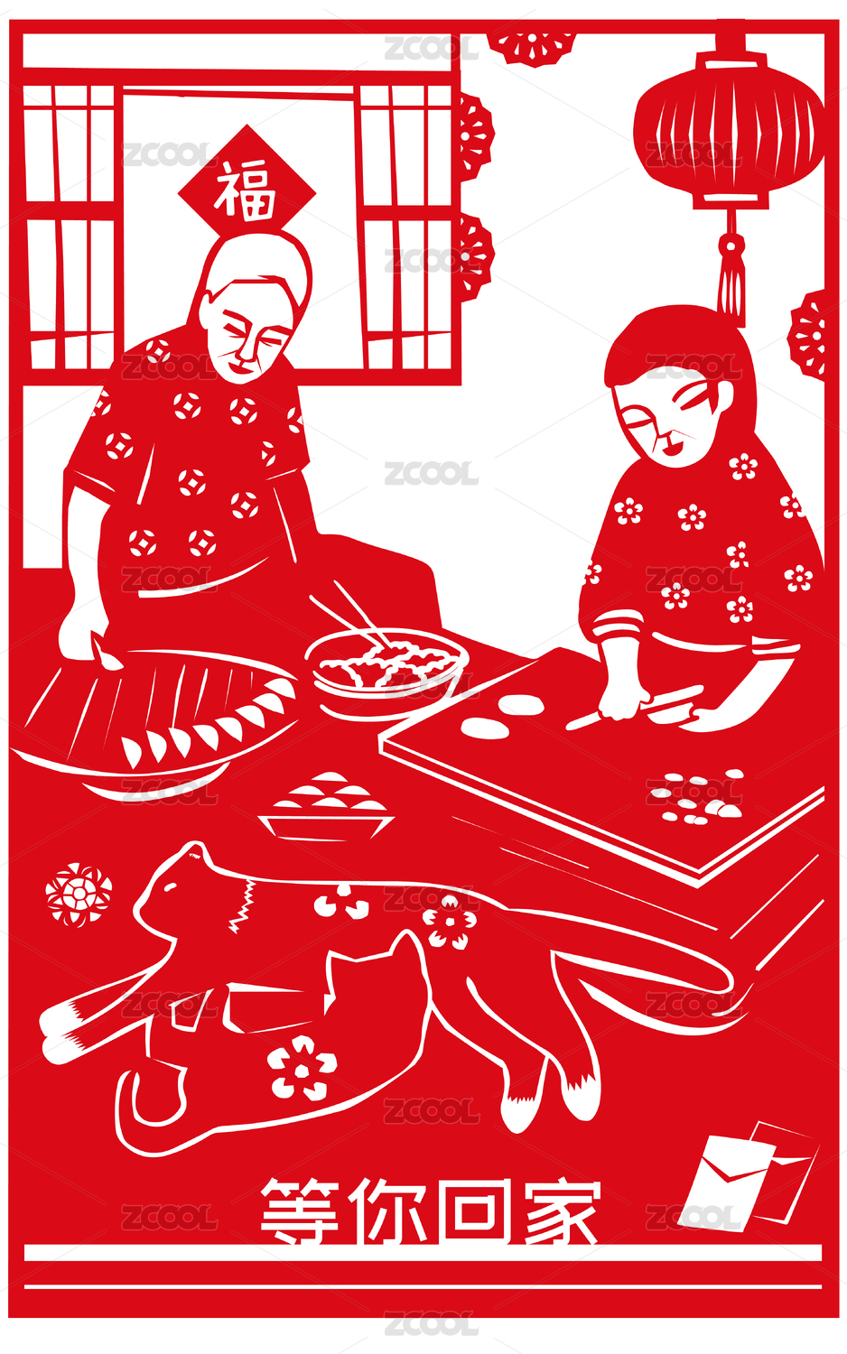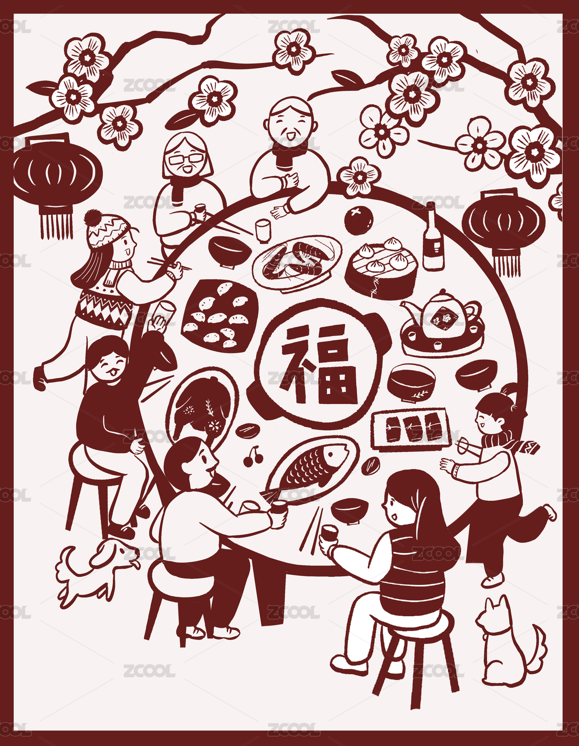 春节团圆饭剪纸风格