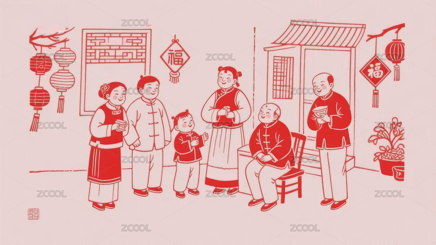 新年剪纸风格团圆插画