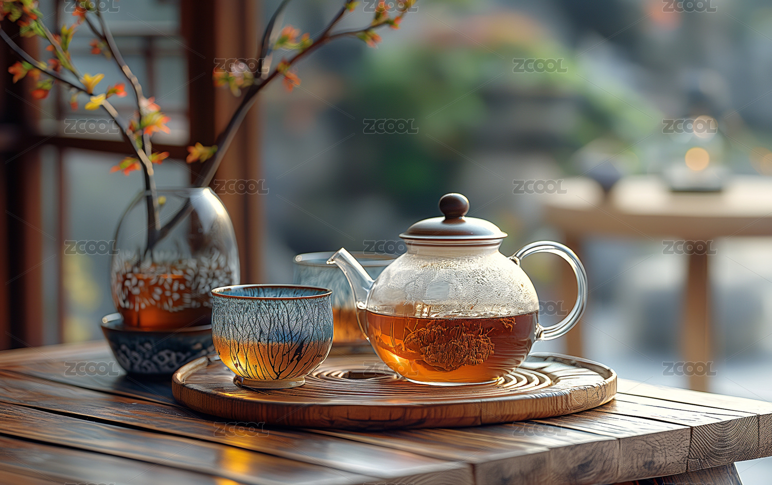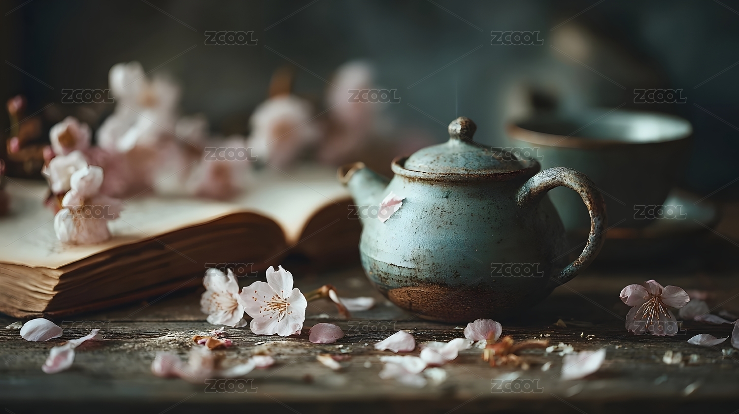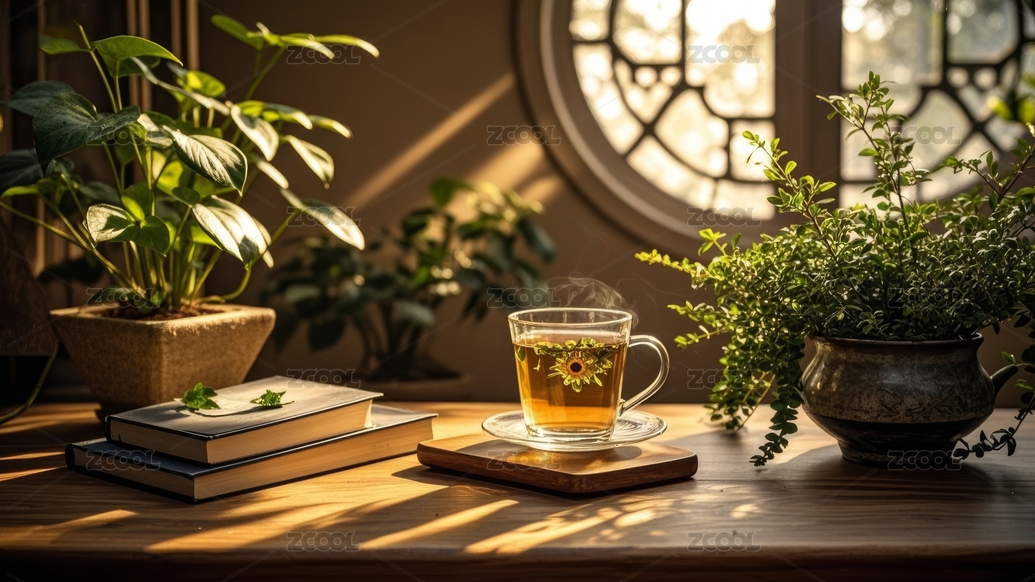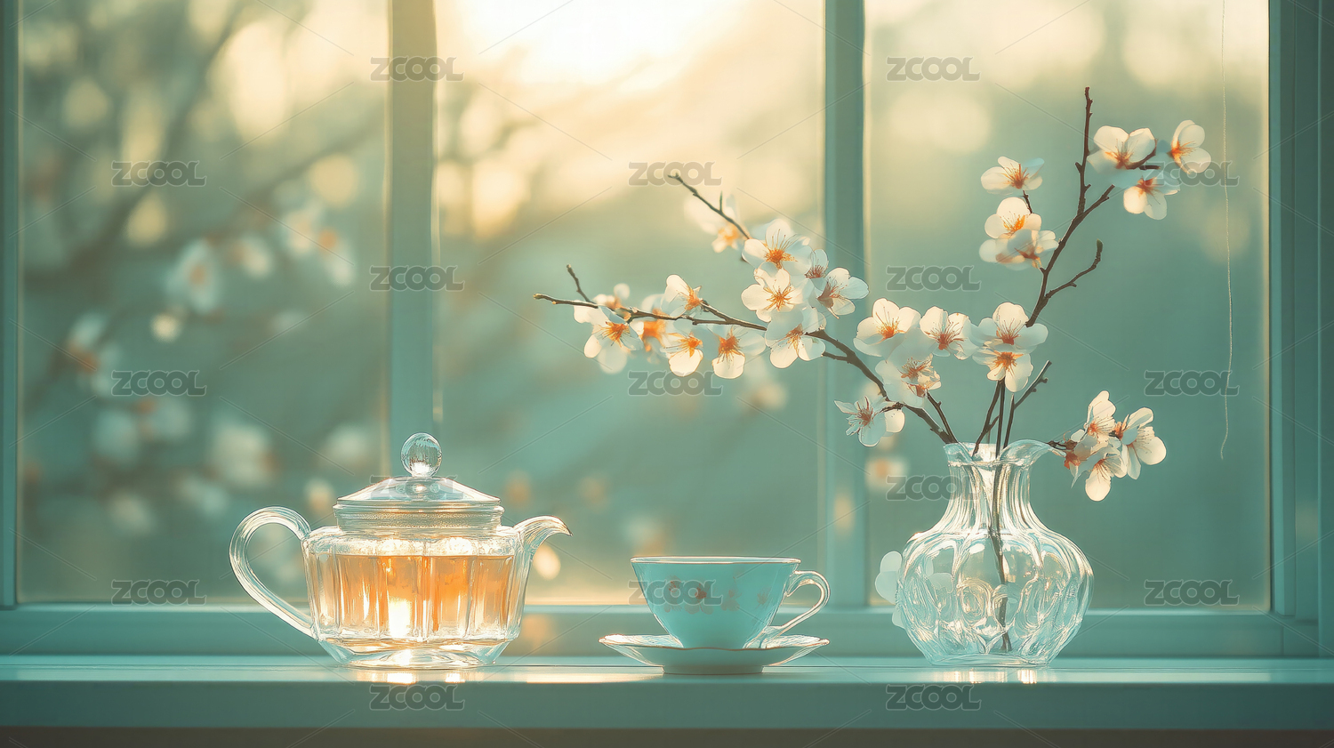 茶壶,茶杯,书本,花朵,绿植,窗户,桌子,茶具,室内,清新