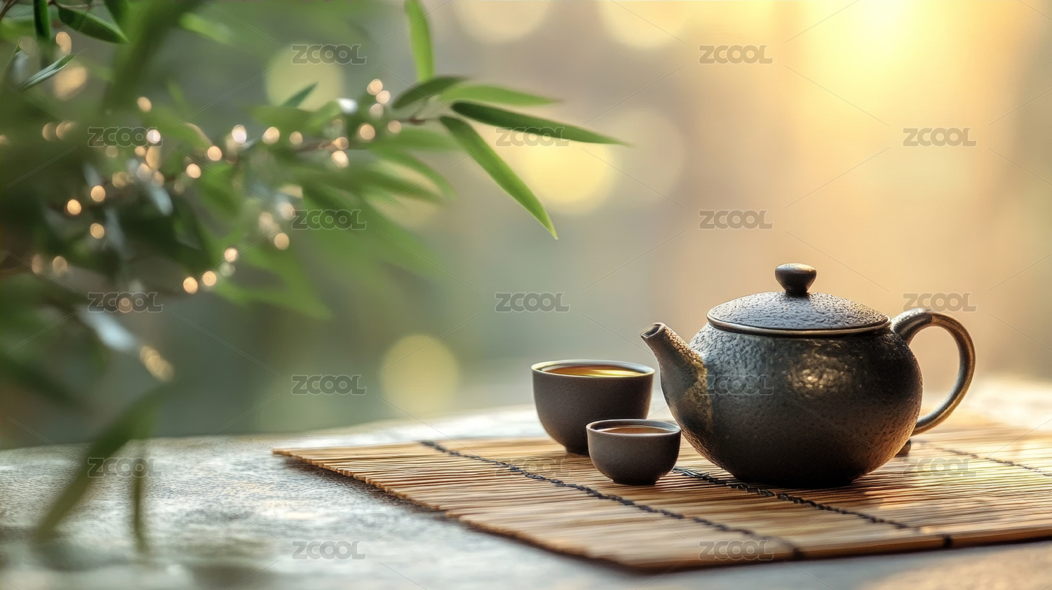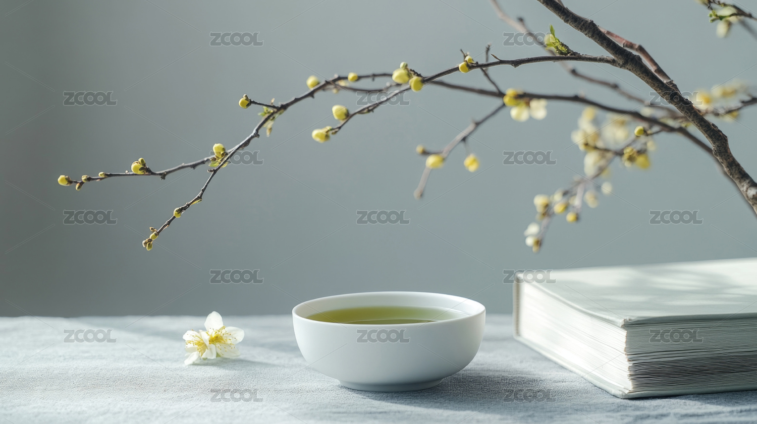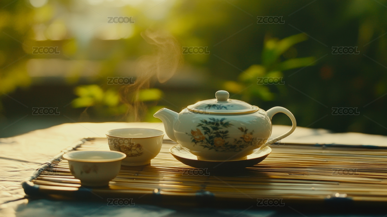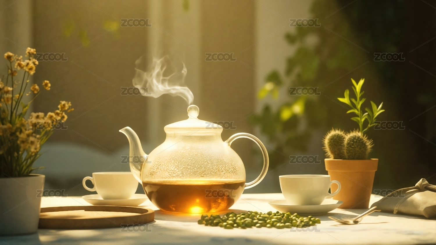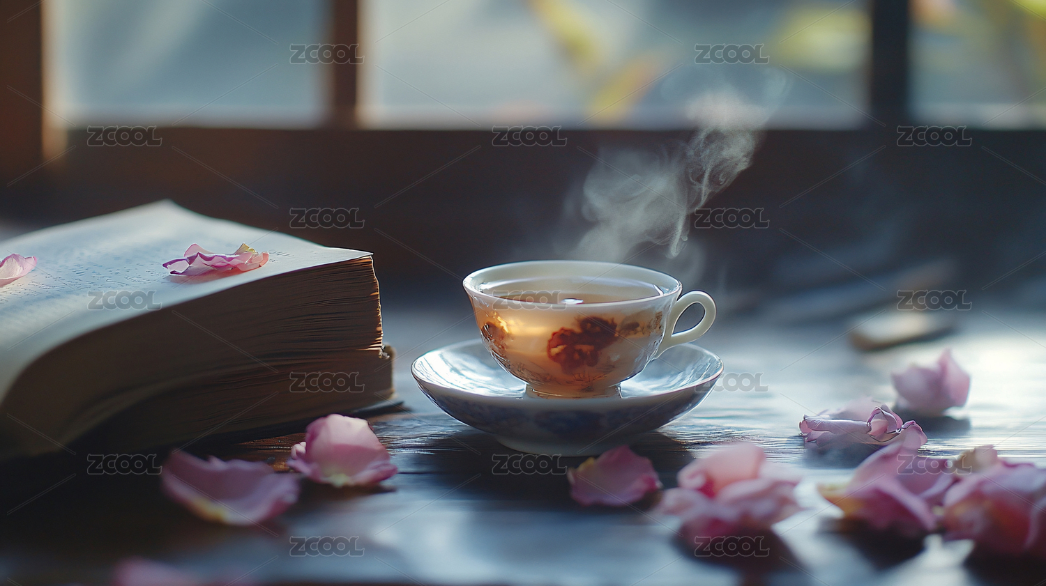 茶壶,茶杯,书本,花朵,绿植,窗户,桌子,茶具,室内,清新