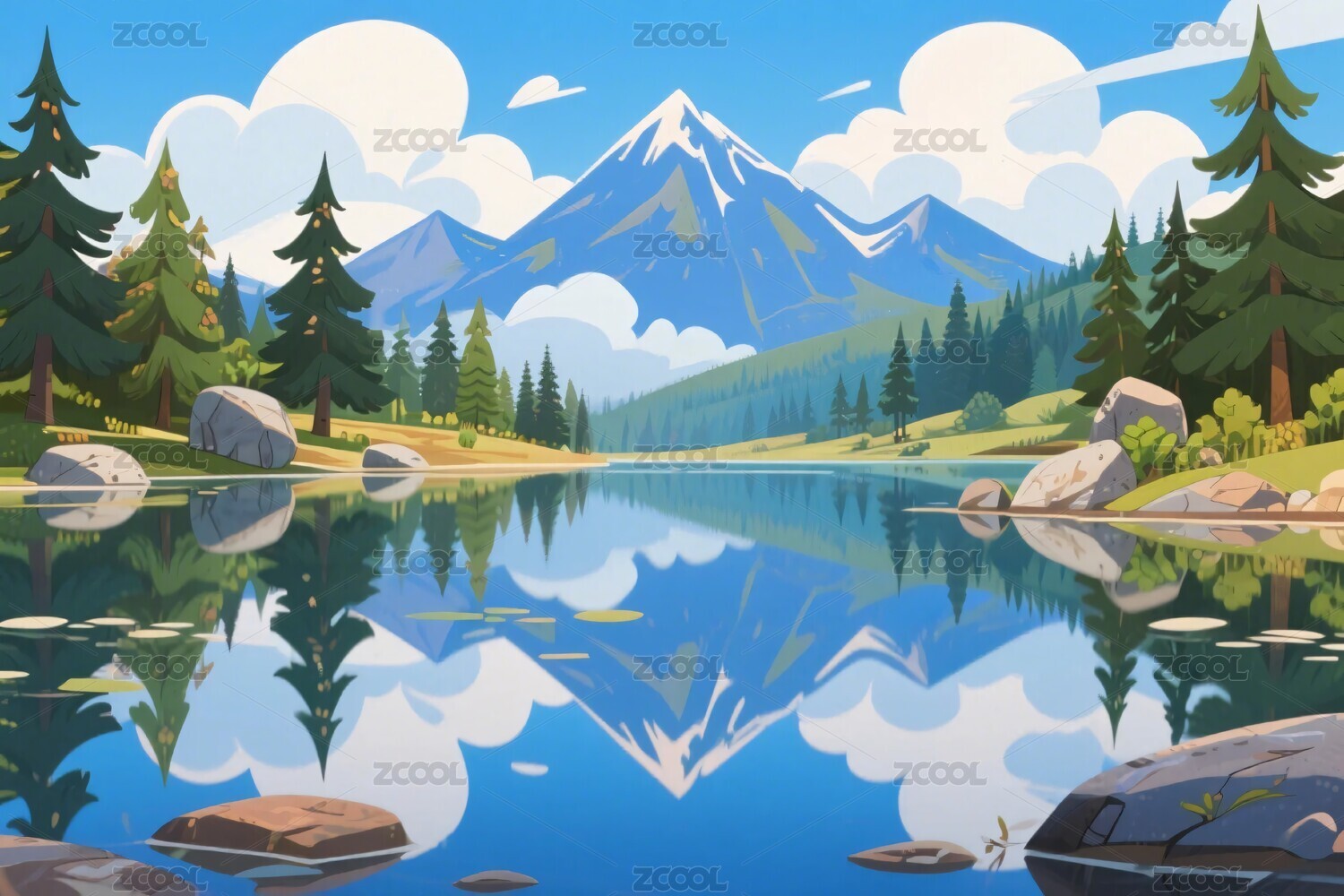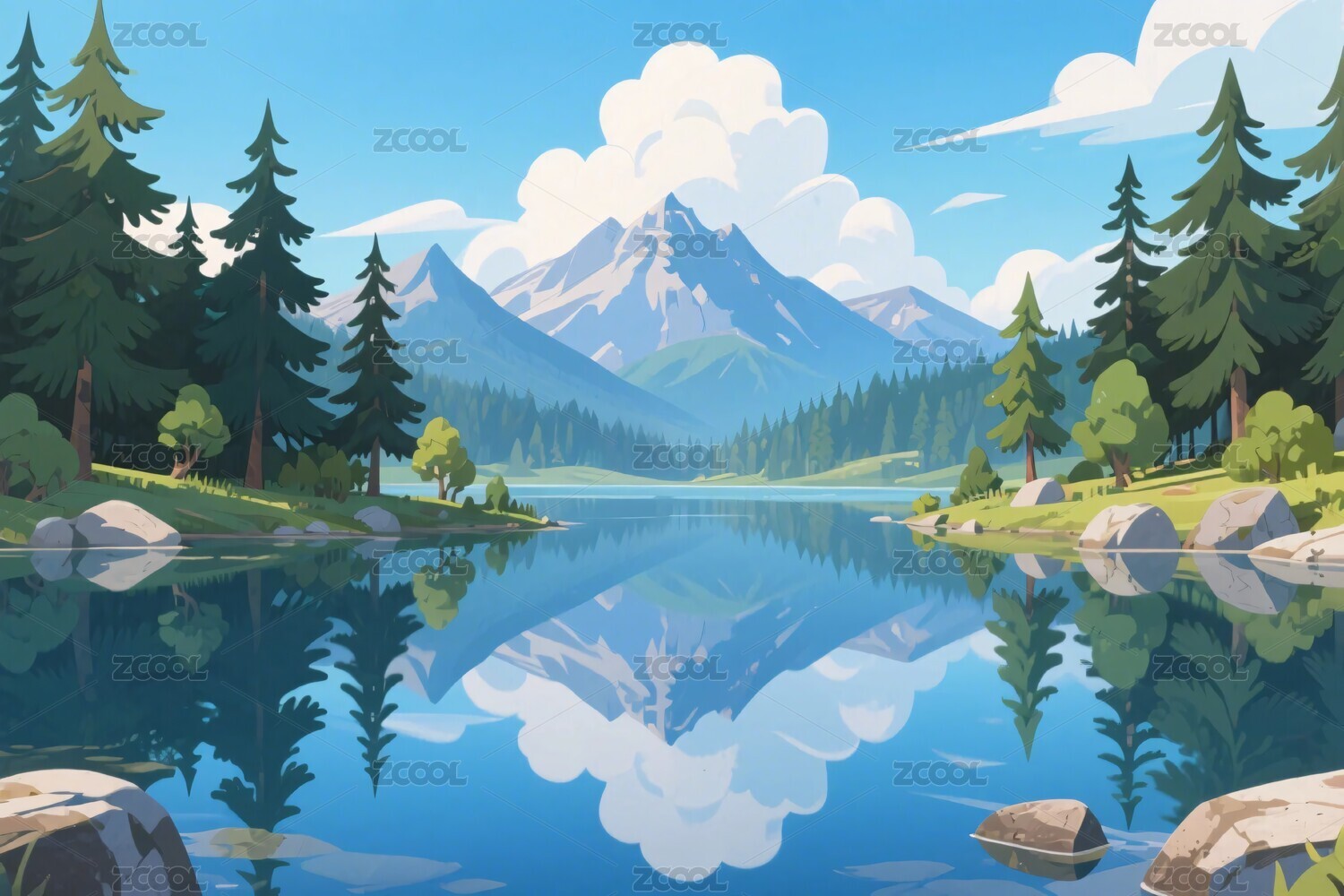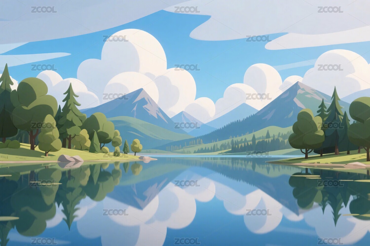 山水,风景,湖泊,树木,山脉,天空,云朵,插画,自然,宁静