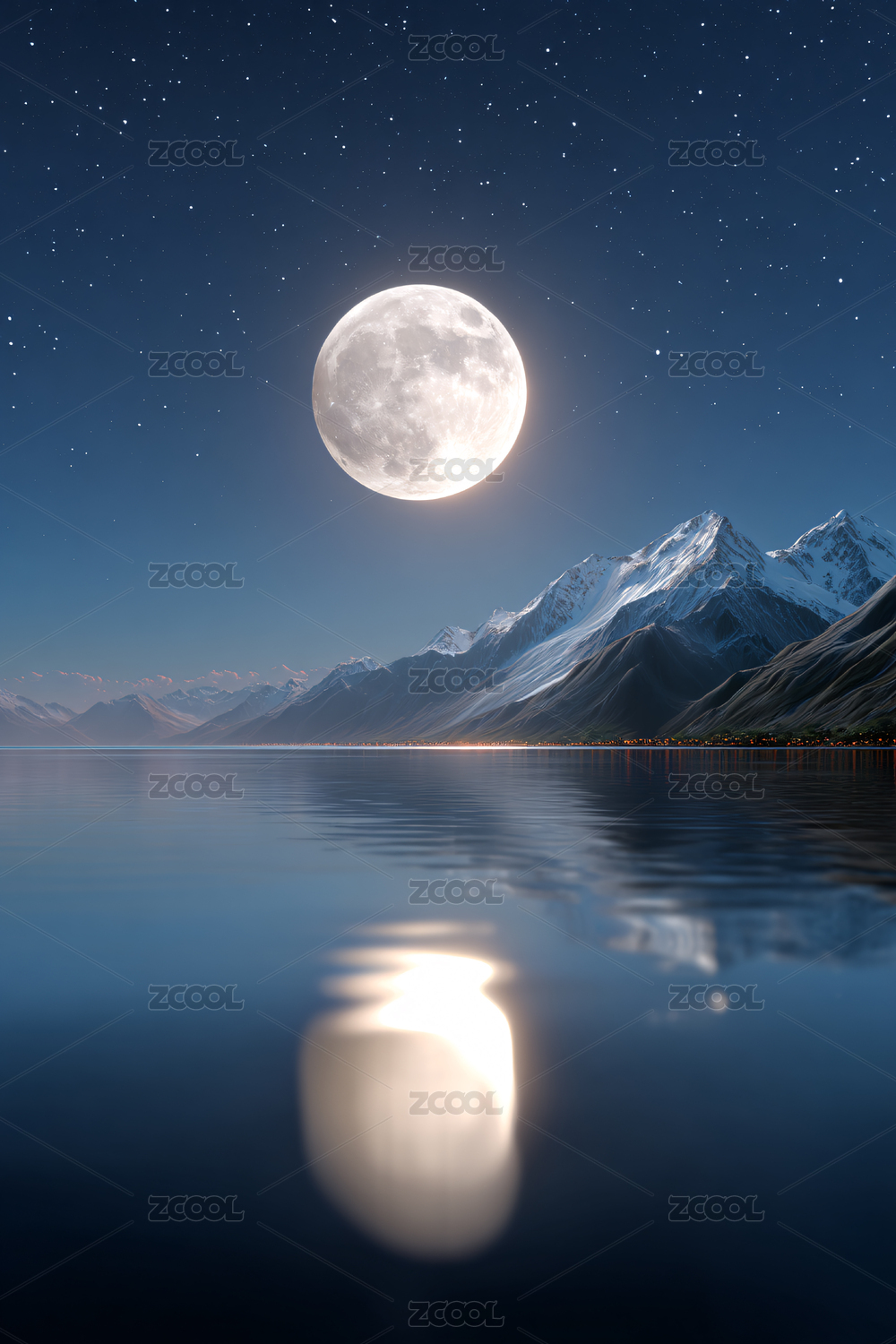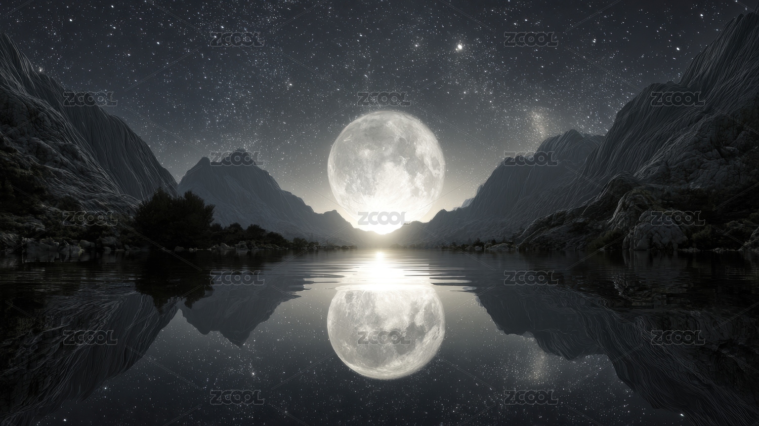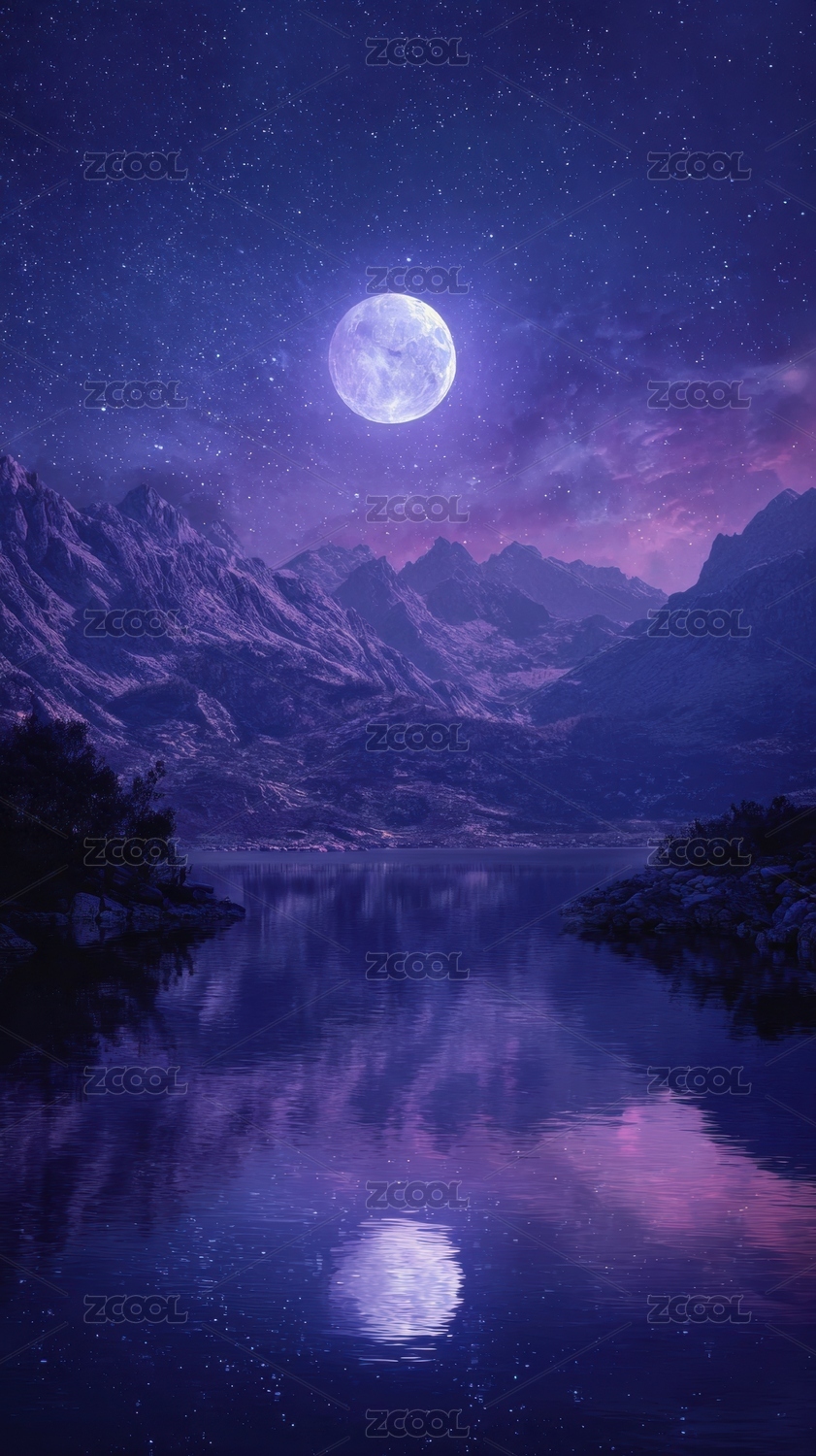 满月映照湖面群山环绕夜景