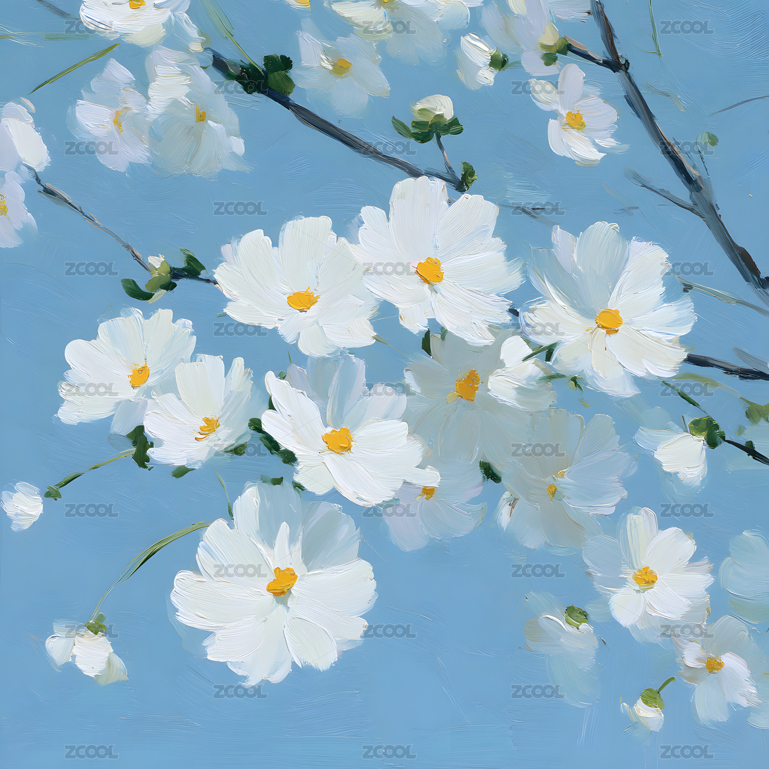 枝桠花朵清新唯美油画