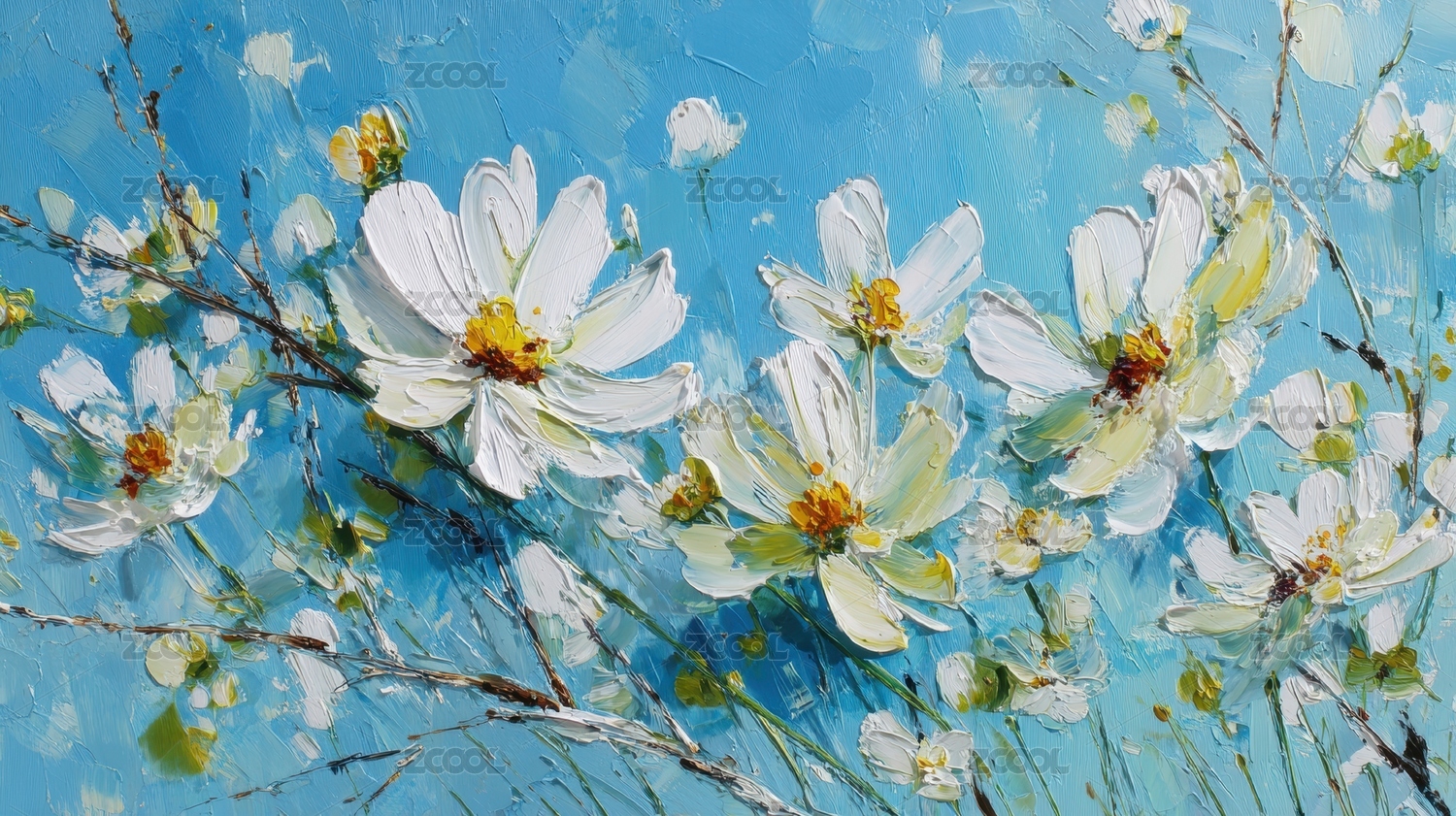 厚涂粗笔触印象派花朵小白花背景海报装饰画