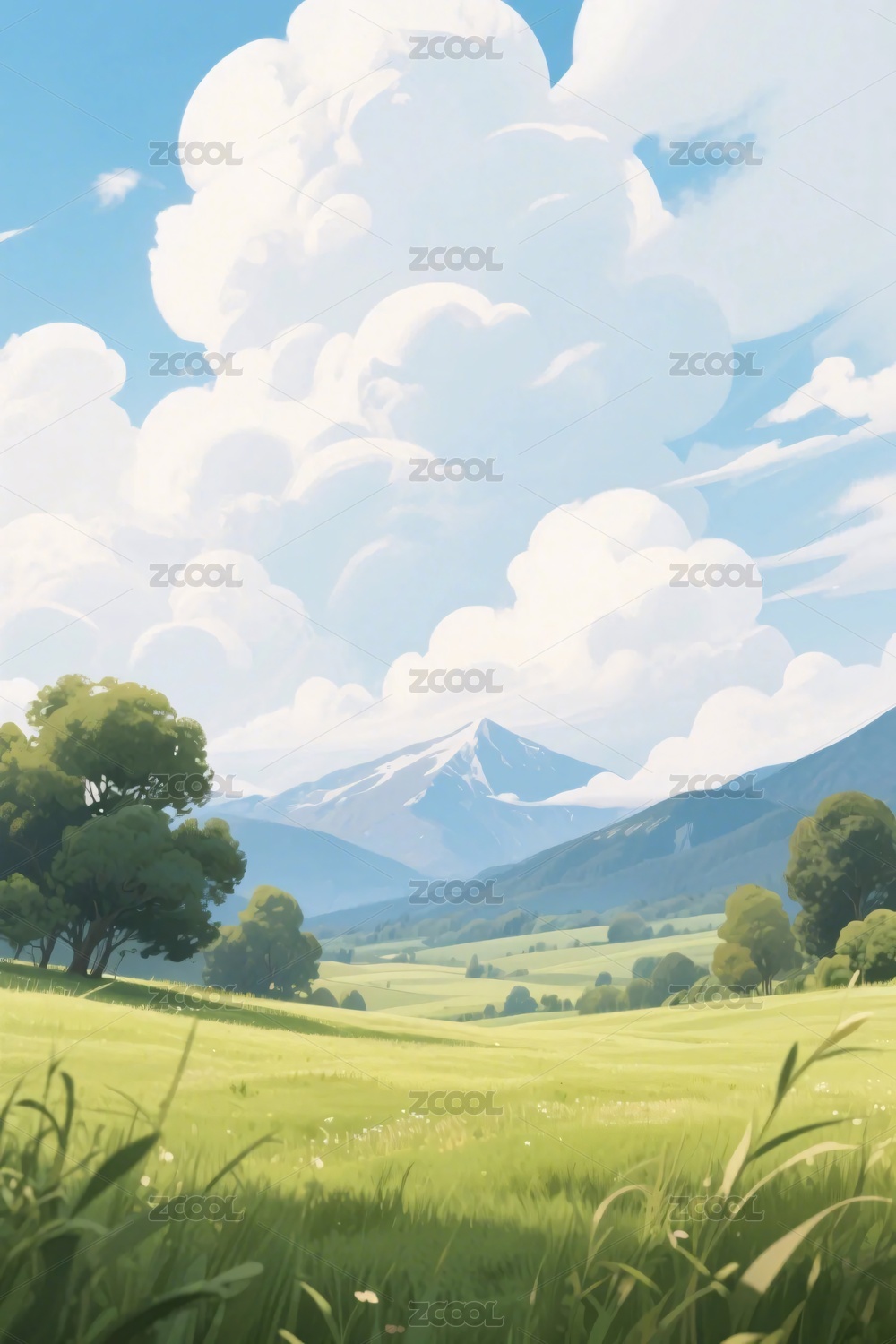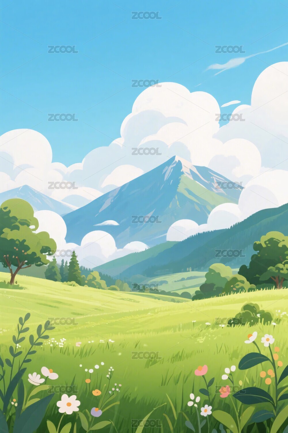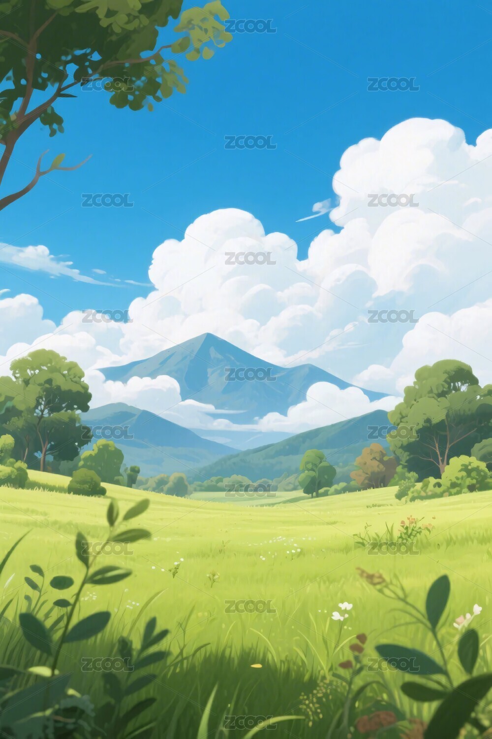 风景,山水,自然,草地,树木,天空,云彩,插画,绿色,蓝色