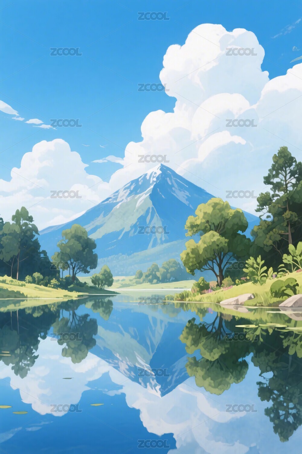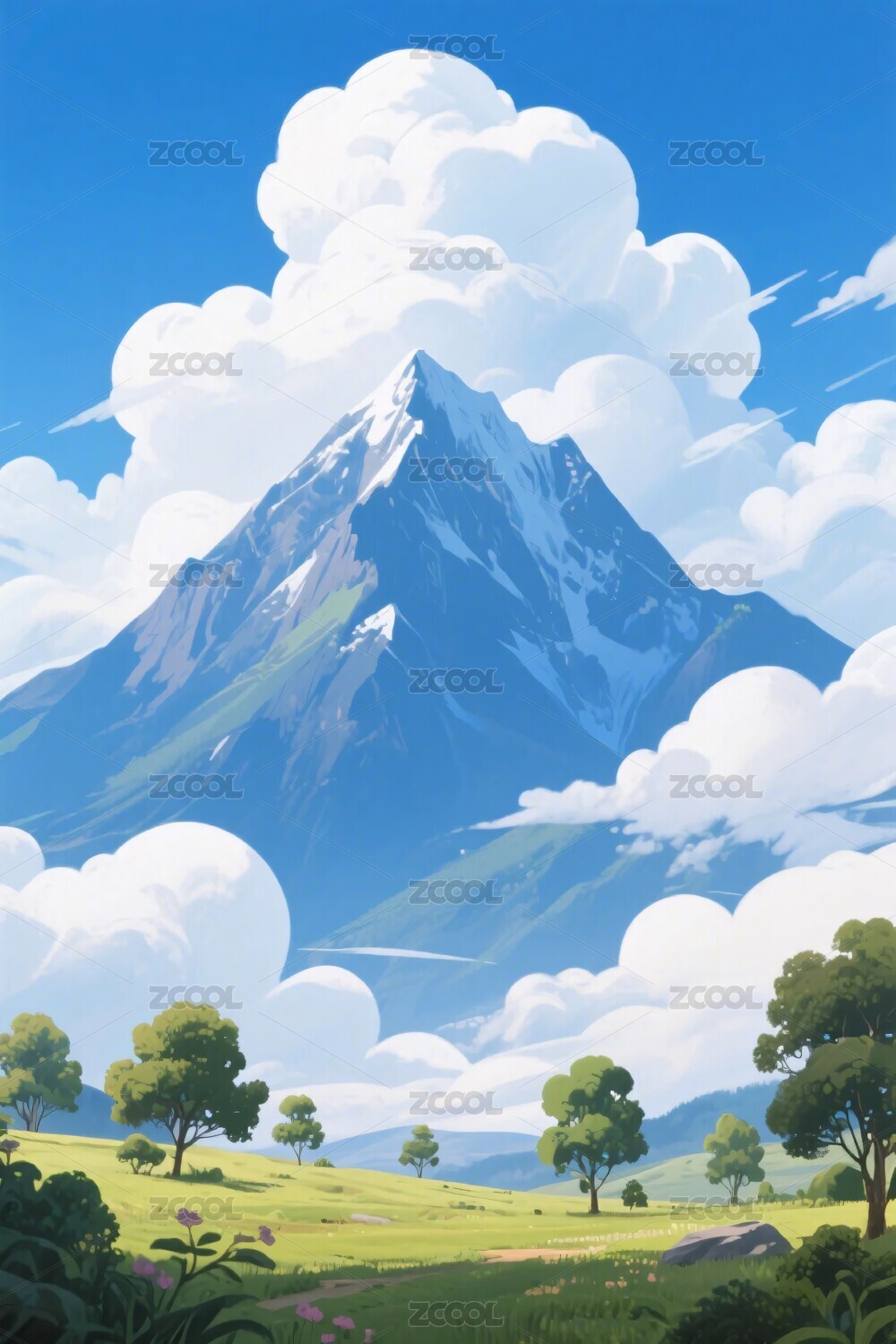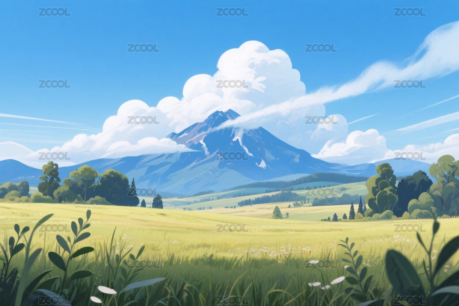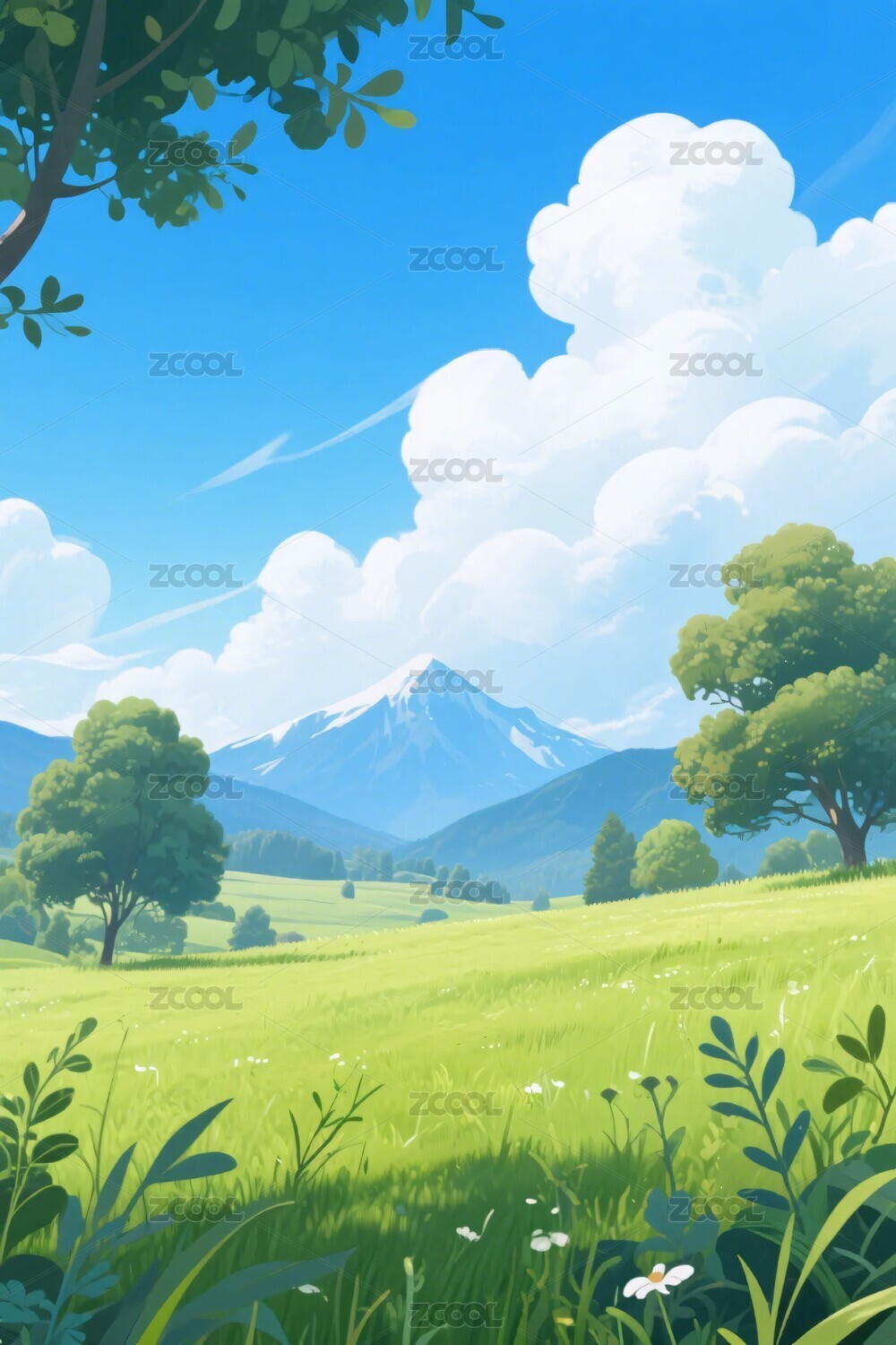 风景,山水,自然,草地,树木,天空,云彩,插画,绿色,蓝色