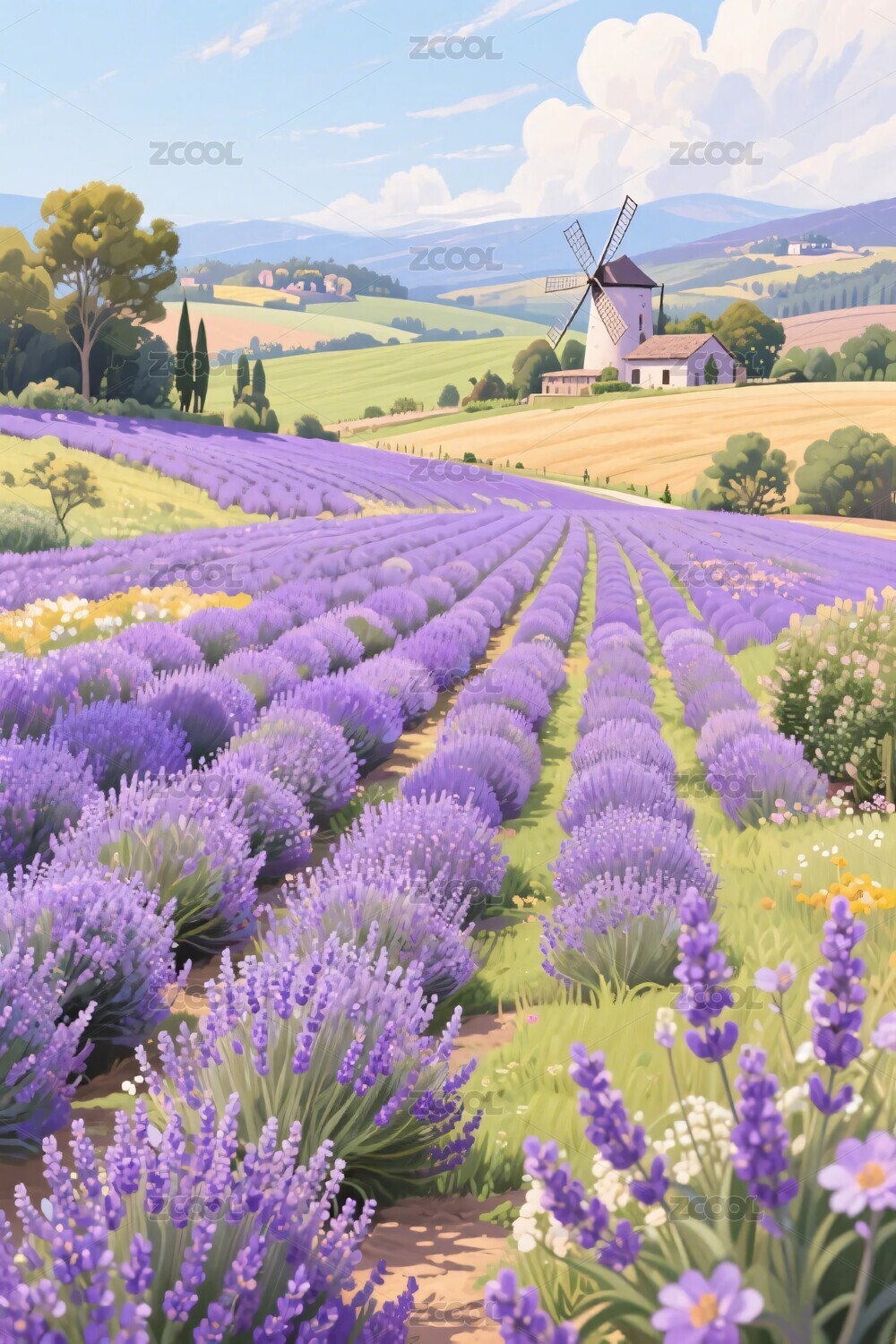 薰衣草,风车,汽车,蓝天,白云,花海,田园,梦幻,插画,背景