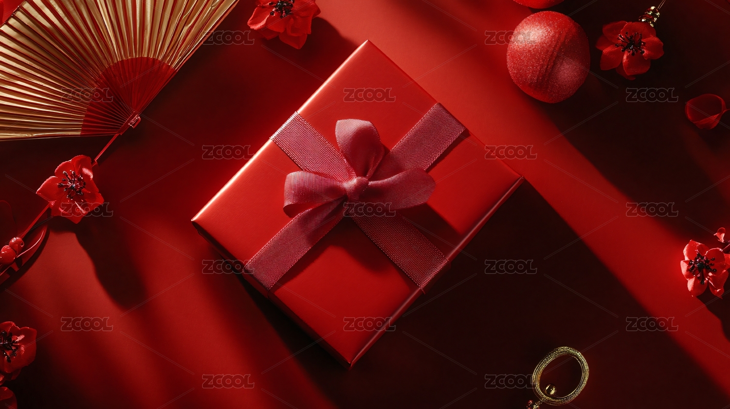 绑着蝴蝶结的红色烫金礼盒,在红色背景下