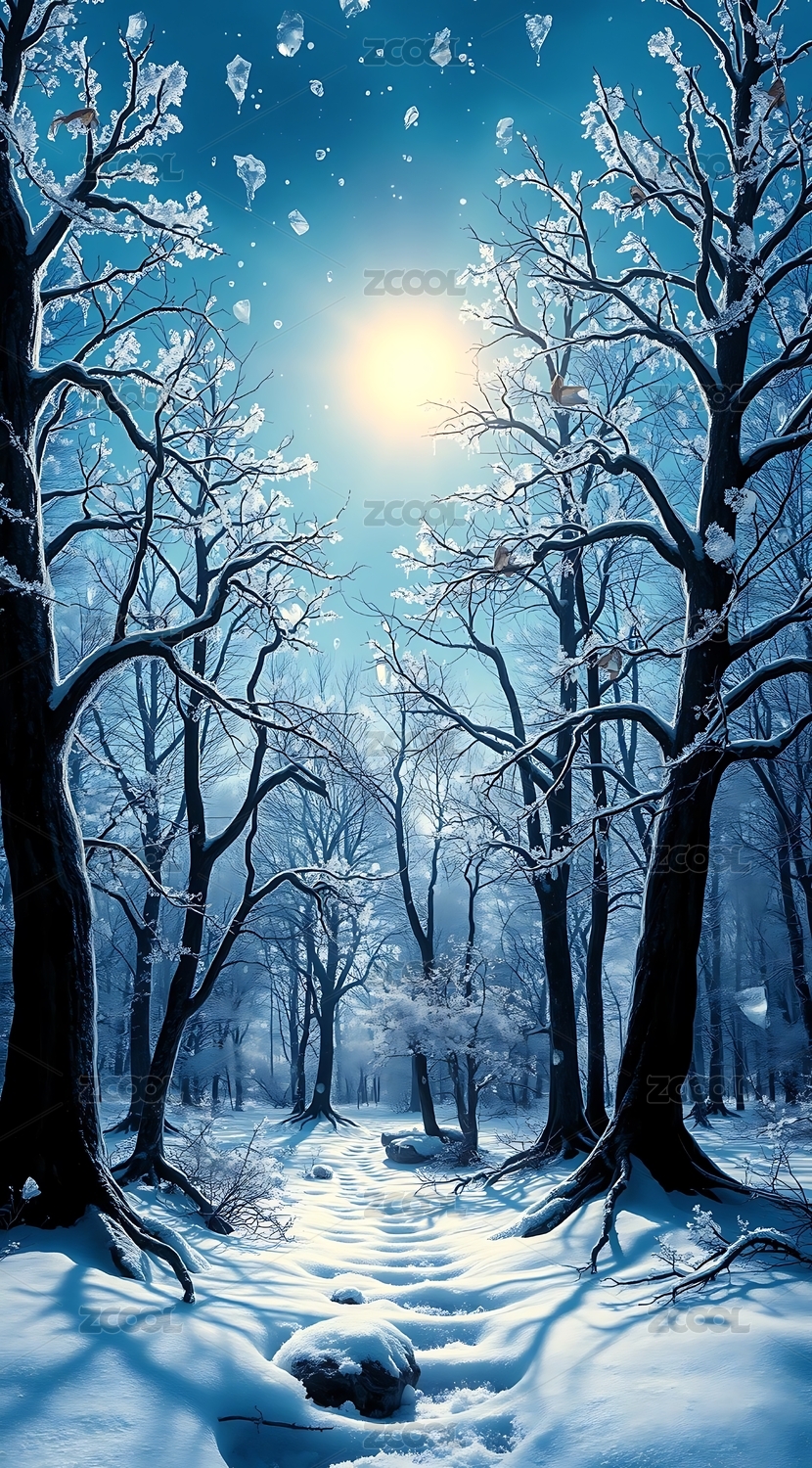 月亮,星空,雪地,树林,夜晚,森林,雪景,插画,夜景,冬季