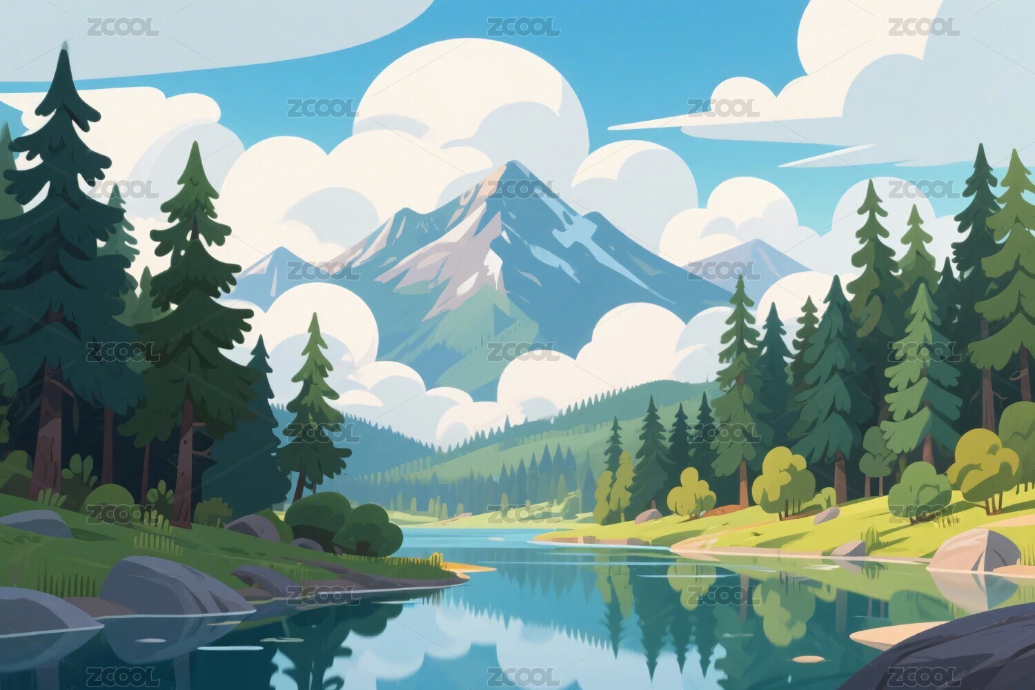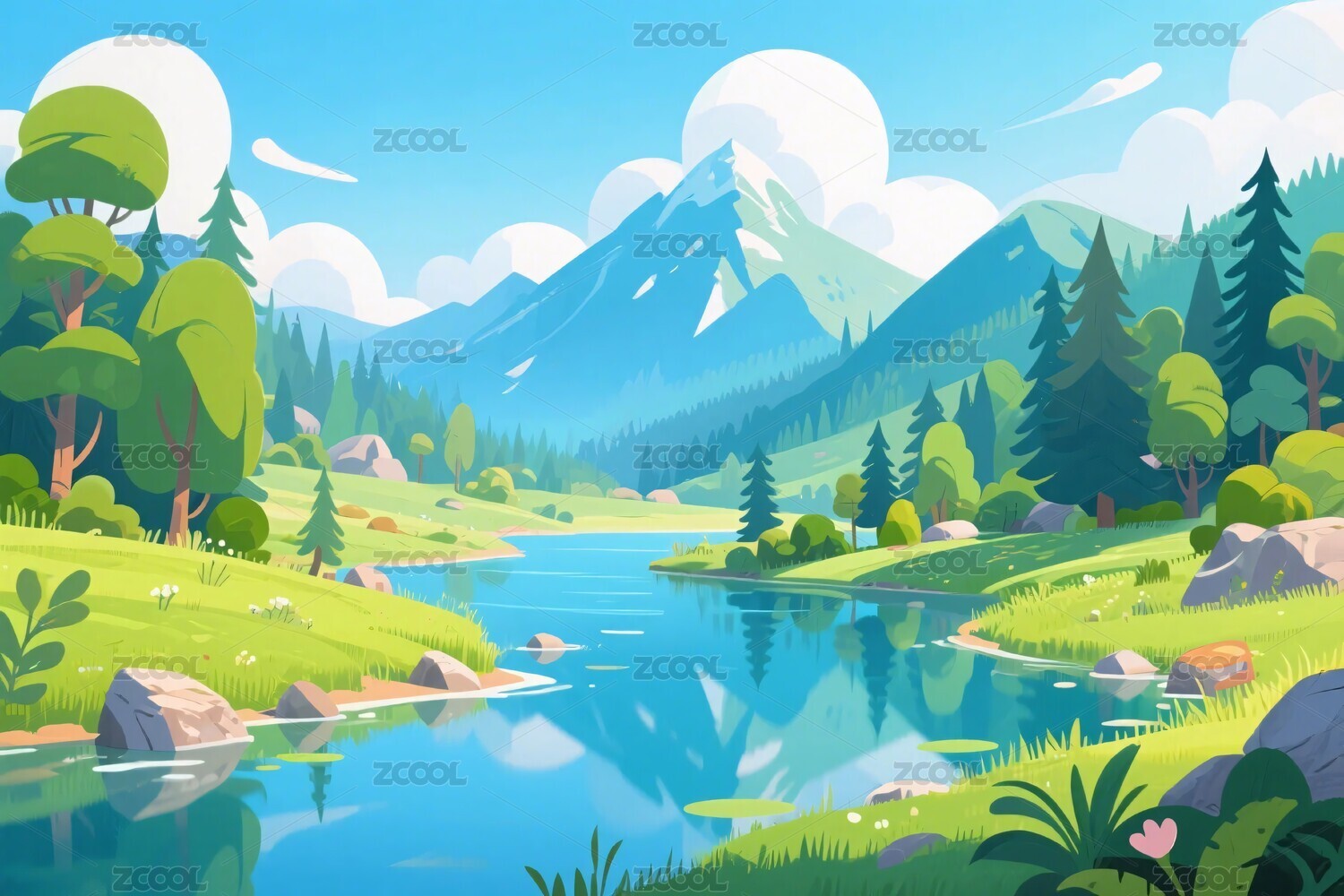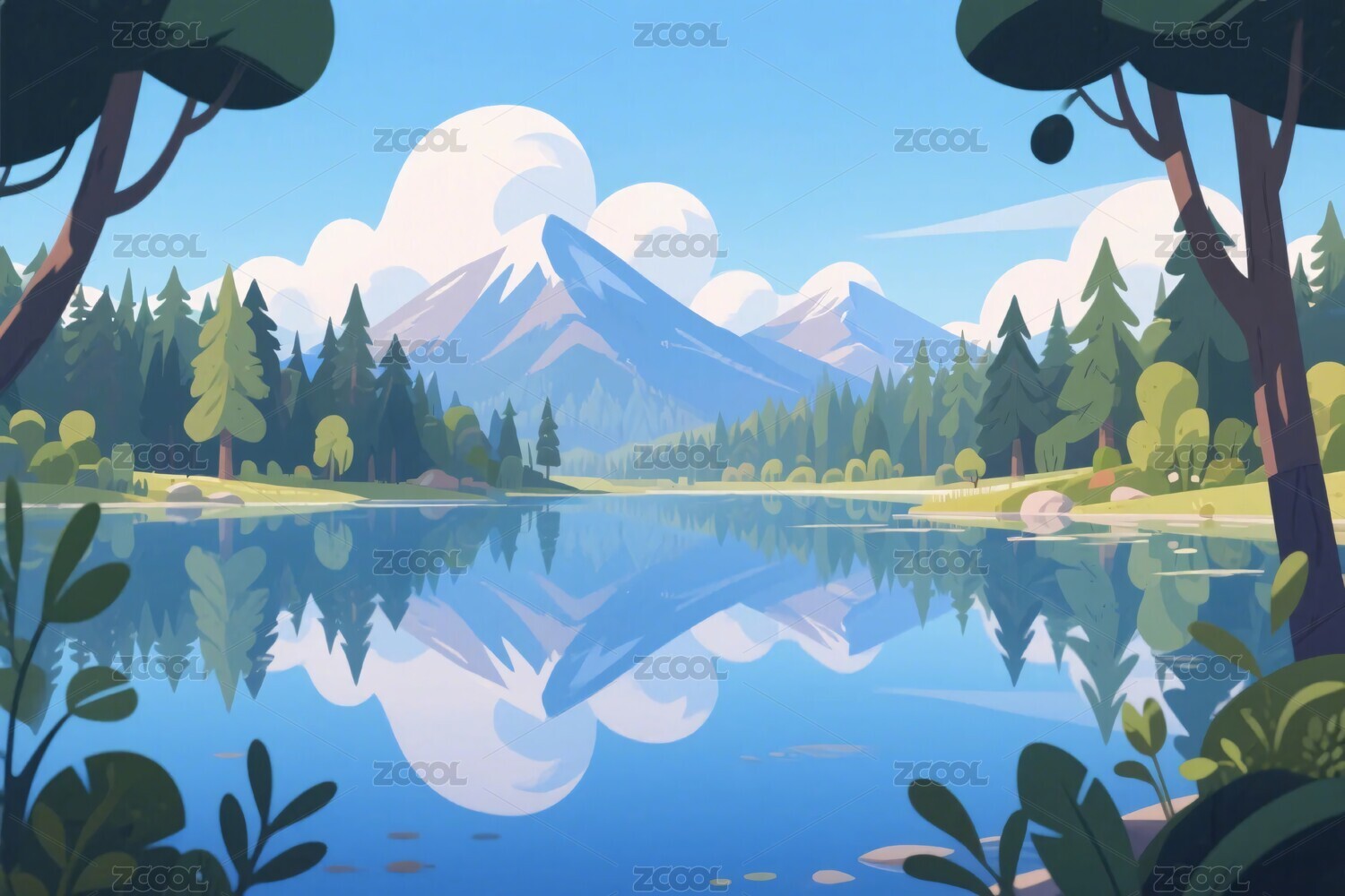 山水,湖泊,树木,蓝天,白云,绿地,森林,自然风景,插画,卡通
