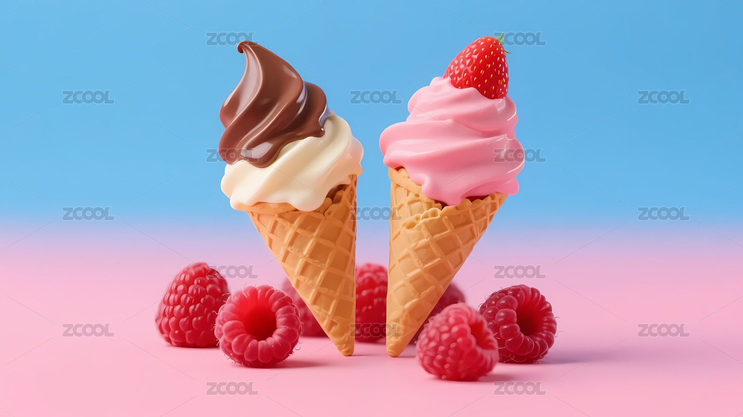 冰淇淋,甜筒,水果,草莓,樱桃,蓝莓,树莓,牛奶飞溅,冰块,粉色背景