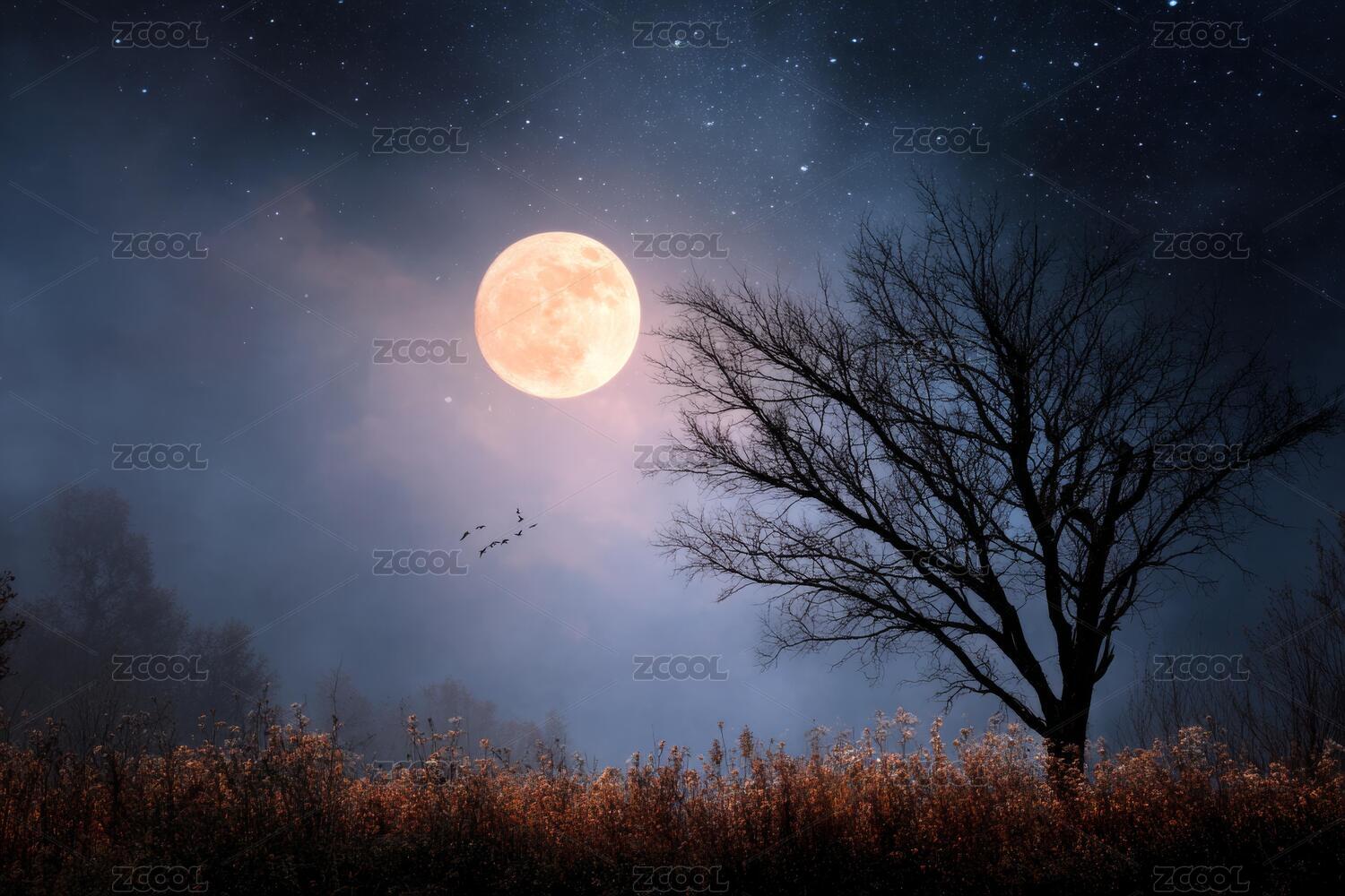 月亮,夜晚,湖面,倒影,孤树,雾,星空,静谧,自然,风景