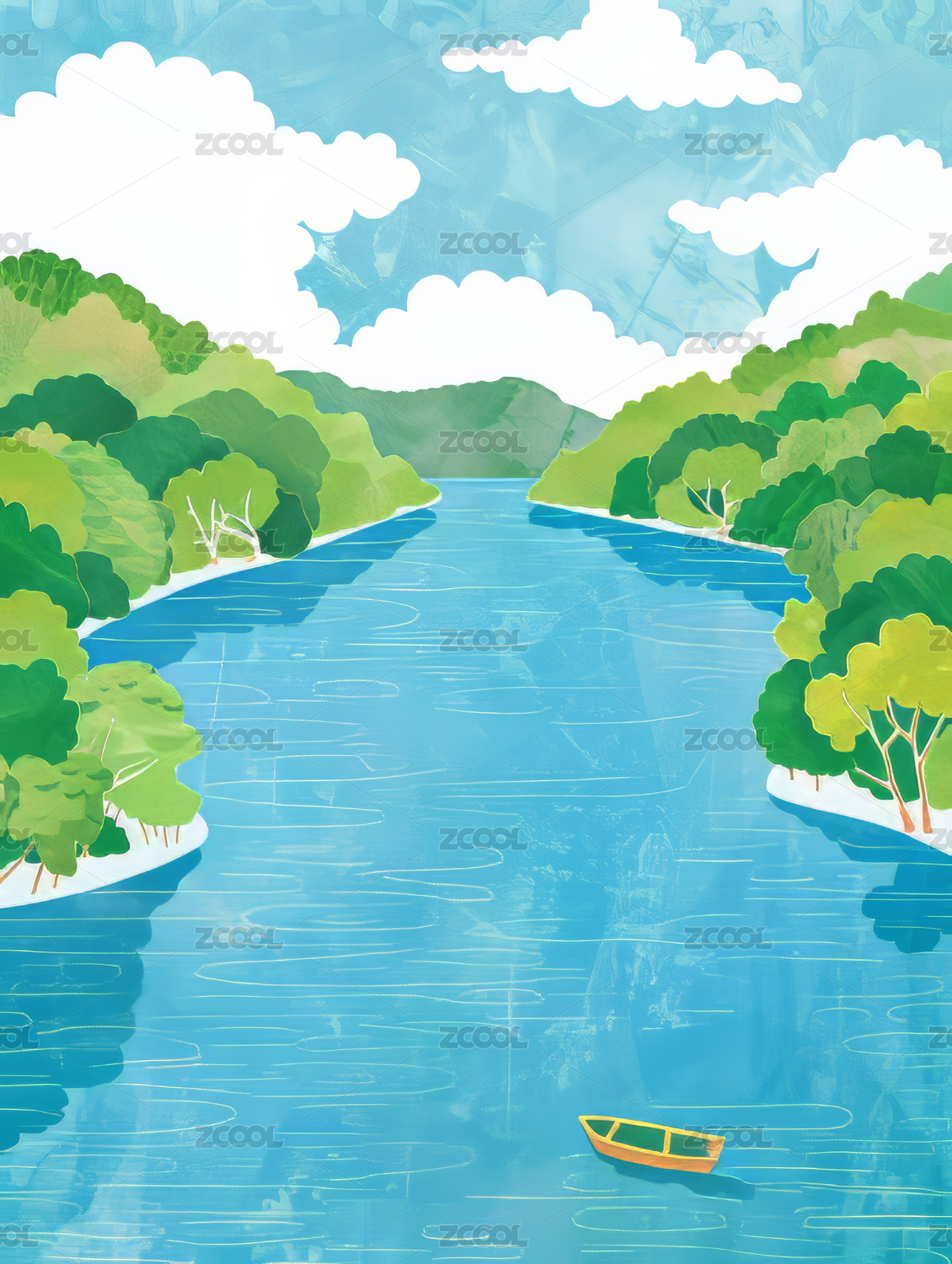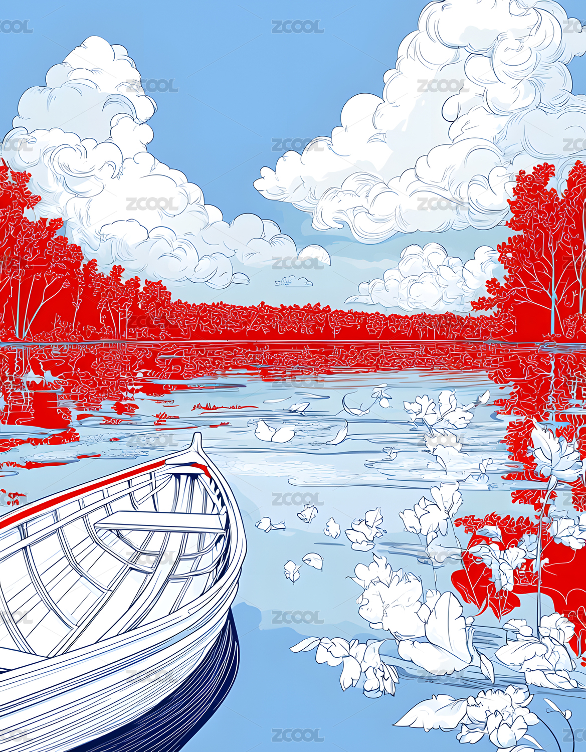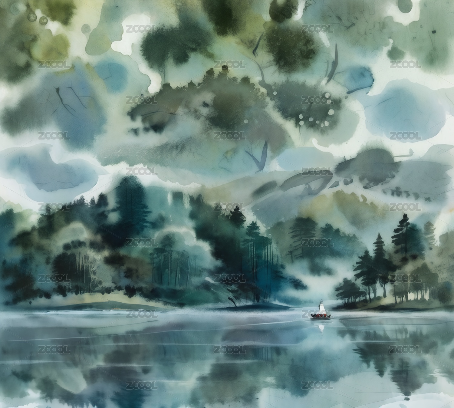 水彩画,湖面,小船,倒影,风景,树木,湖泊,天空,云彩,自然
