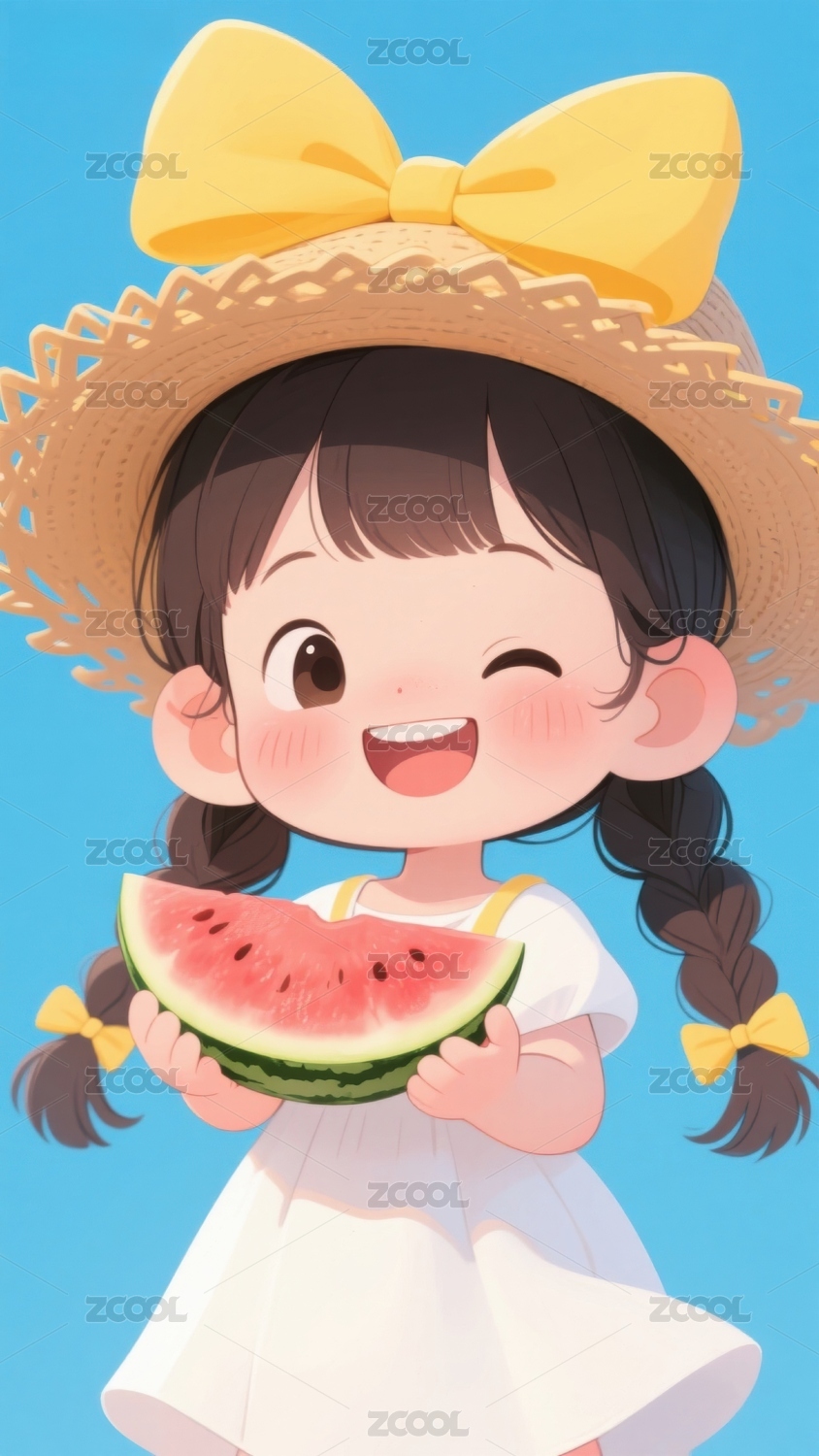 女孩,西瓜,草帽,双马尾,笑脸,夏天,卡通,可爱,开心,清凉