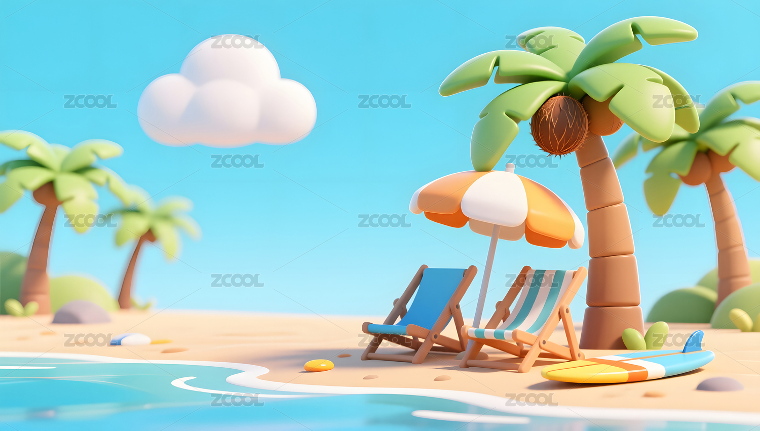 夏天海边沙滩度假旅游夏季海滩清新3D插画