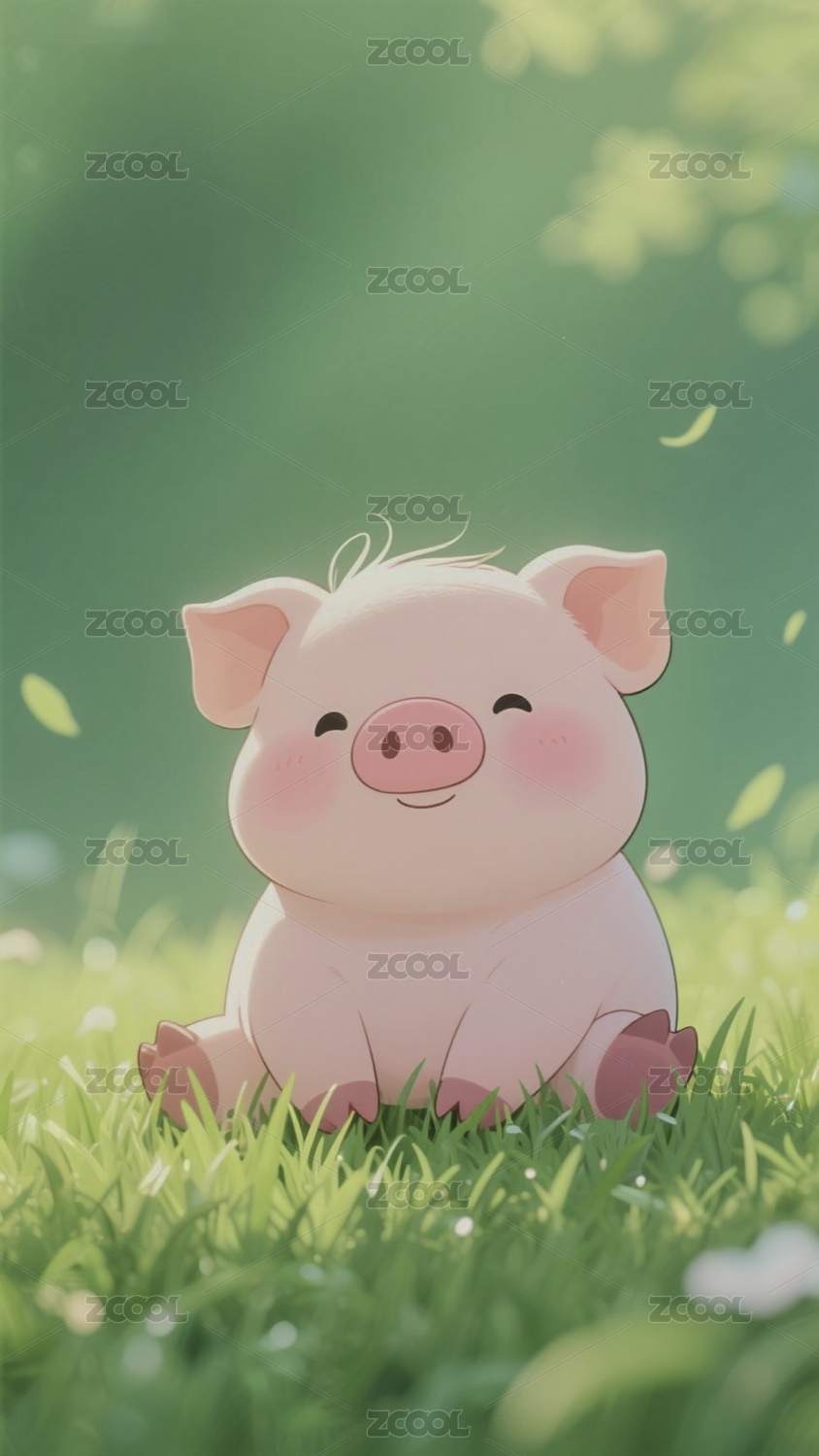小猪,微笑,草地,萌宠,可爱,春日,阳光,卡通,粉色,青草