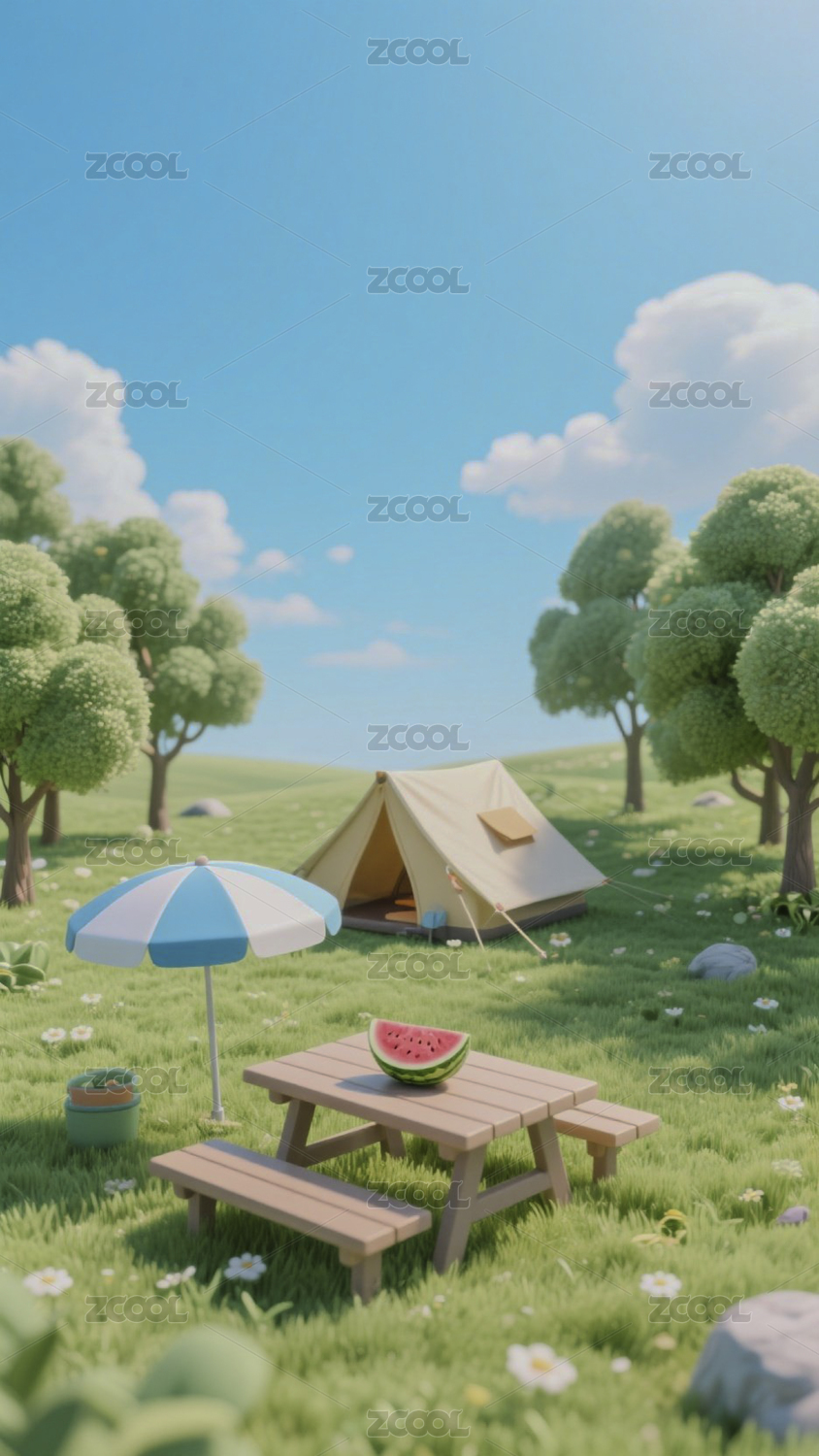 露营,野餐,西瓜,夏日,户外,帐篷,草地,蓝天白云,树木,木桌