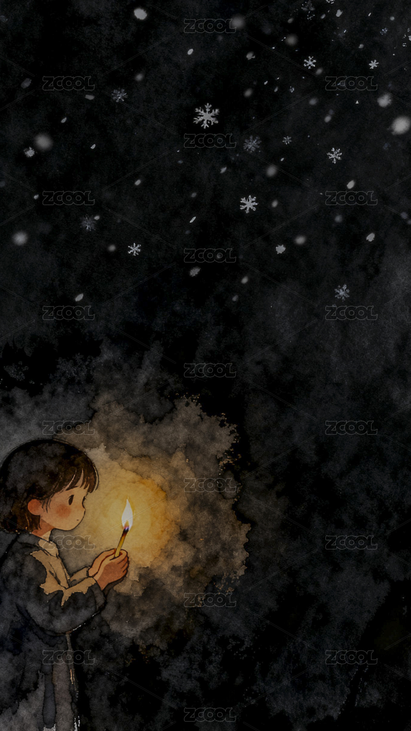 女孩,灯,雪花,黑夜,微光,雪景,孤独,温暖,手绘,插画