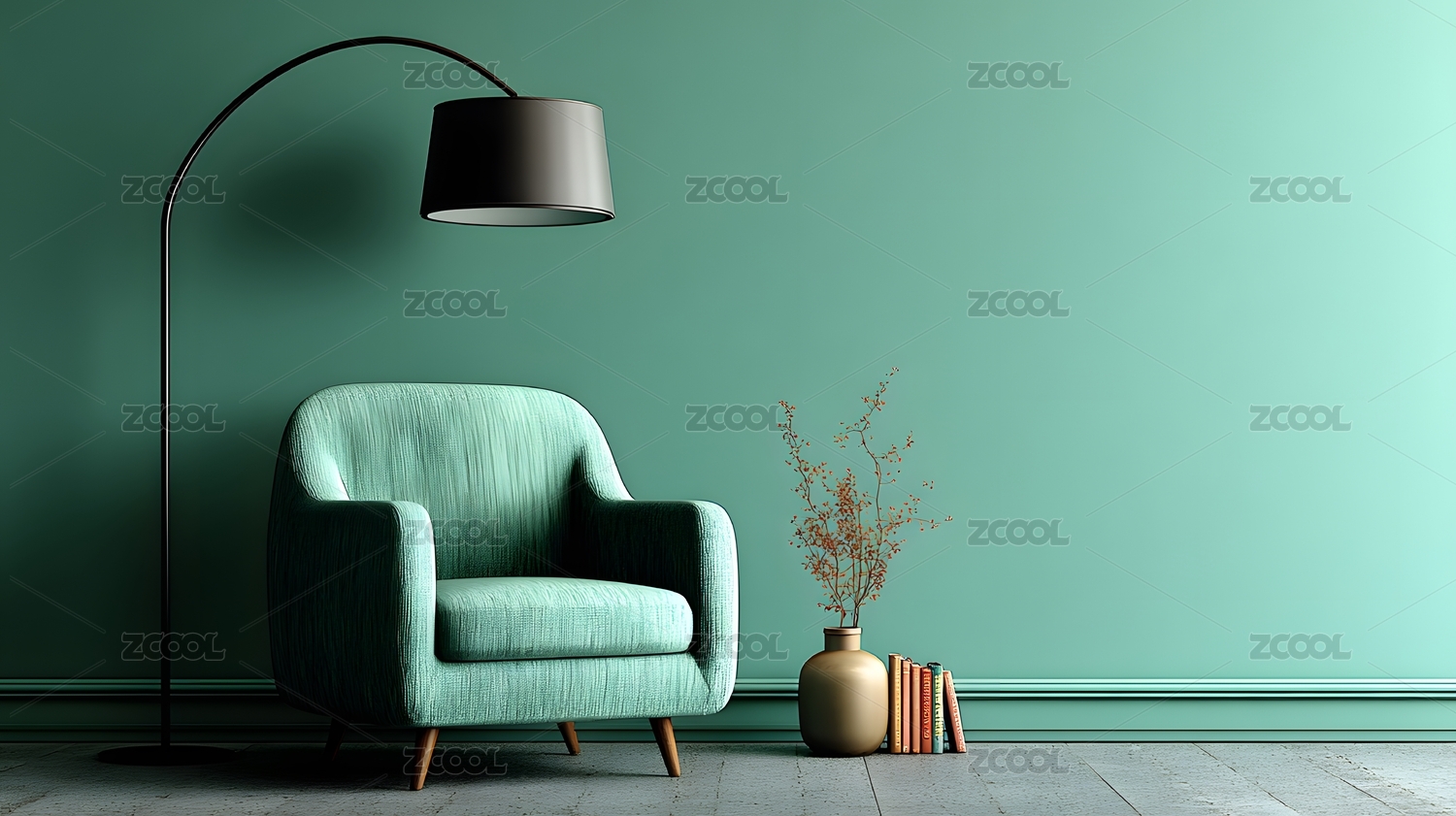 深蓝墙面旁的墨绿扶手椅与落地灯