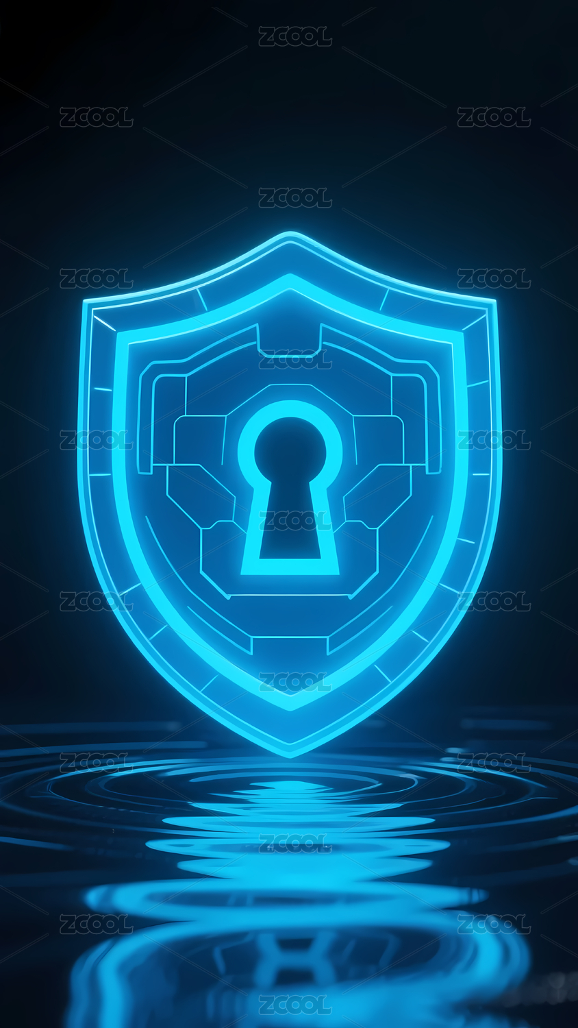 深色,科技,蓝色,发光,盾牌,钥匙孔,水面,反射,安全,防护