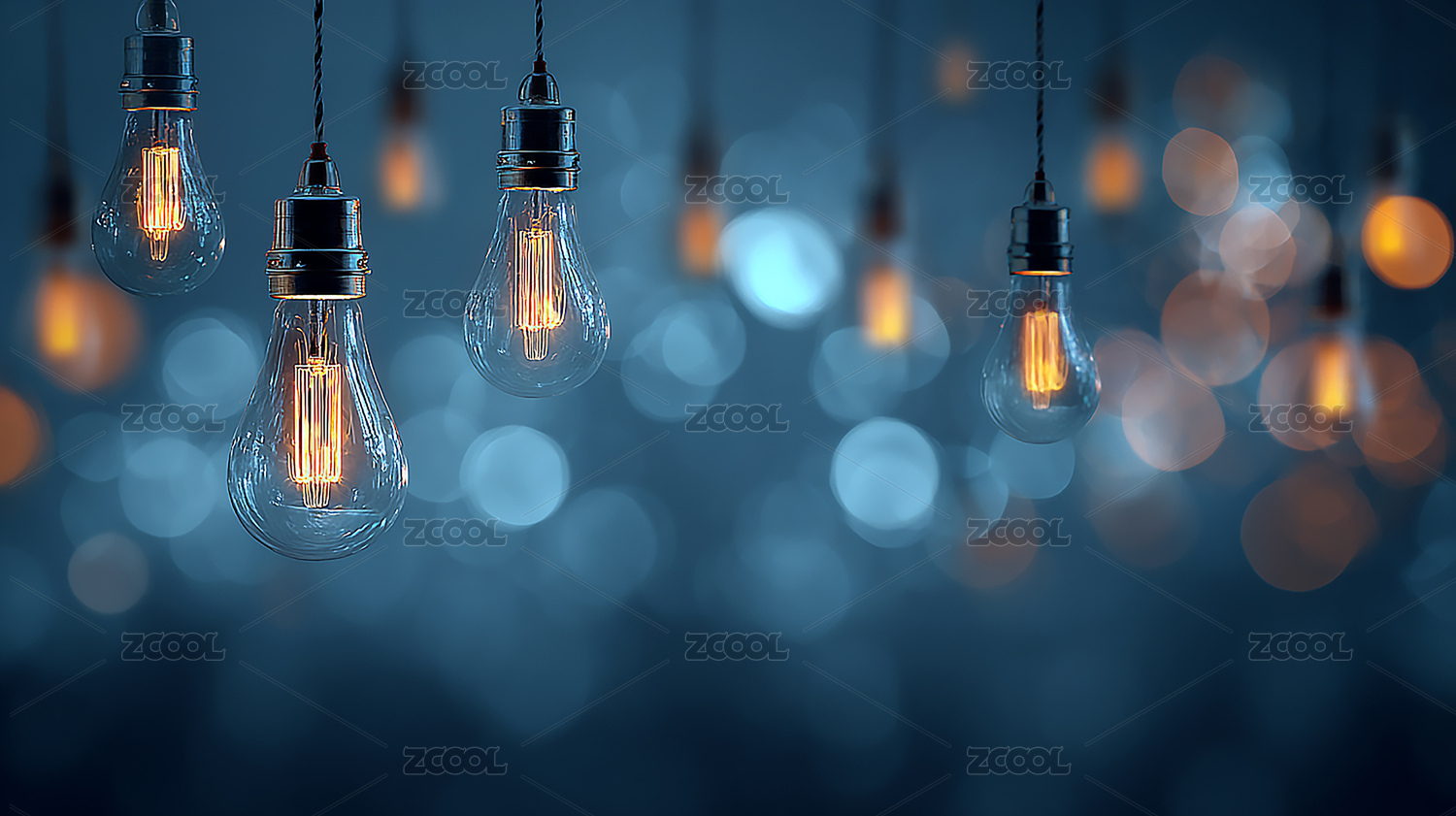 悬挂发光灯泡倒影水中蓝色唯美场景