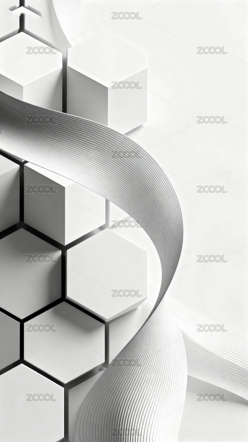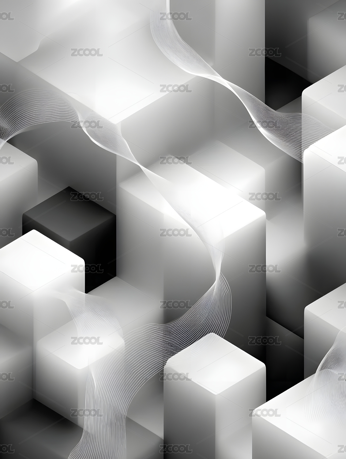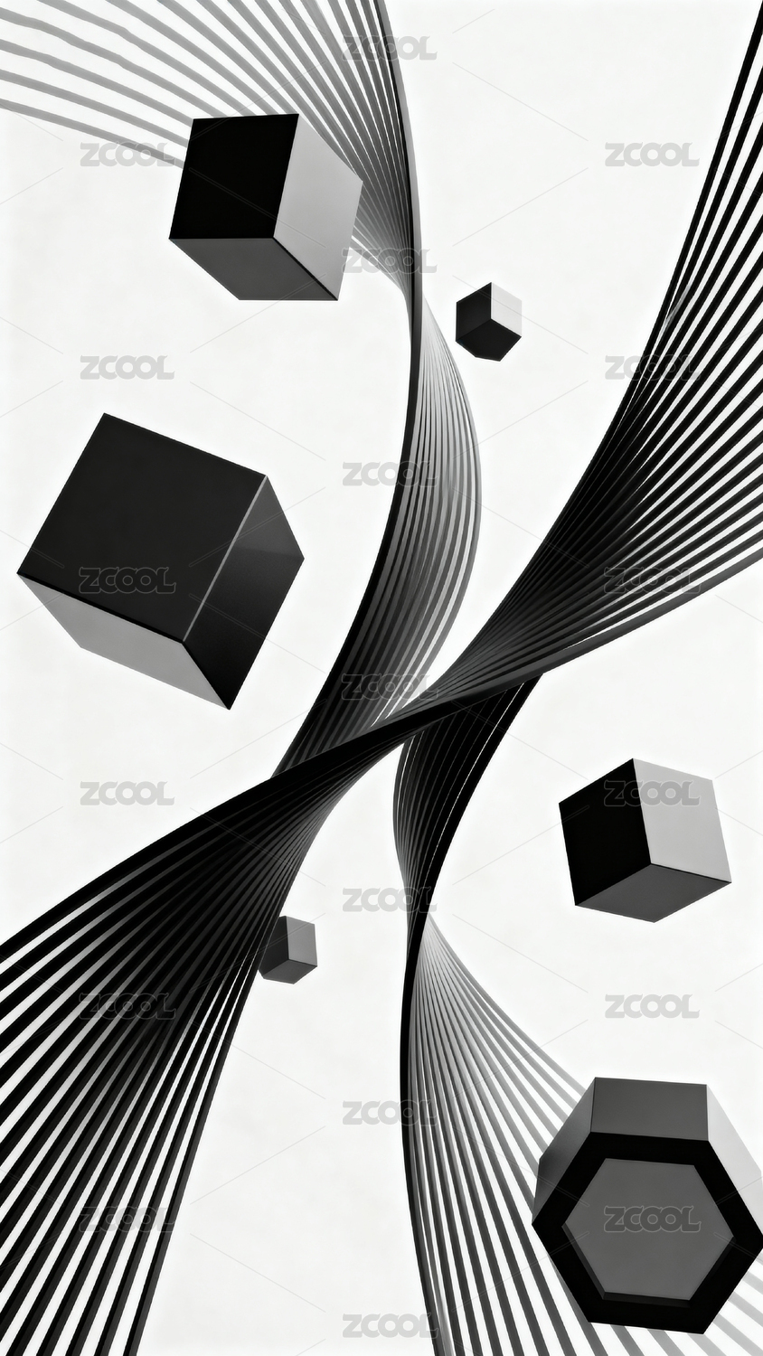 黑白立方体与波浪线条艺术构图