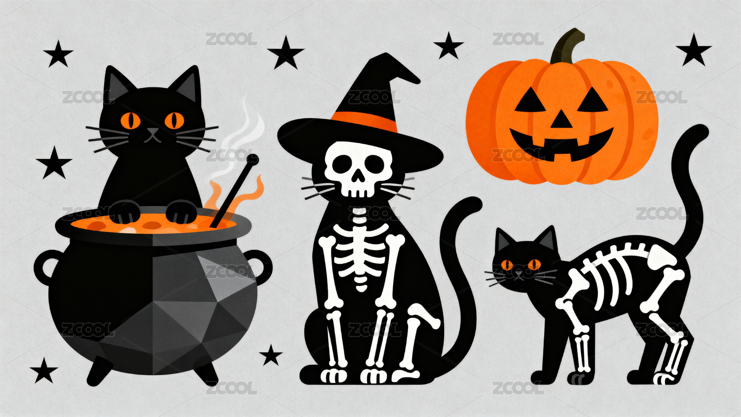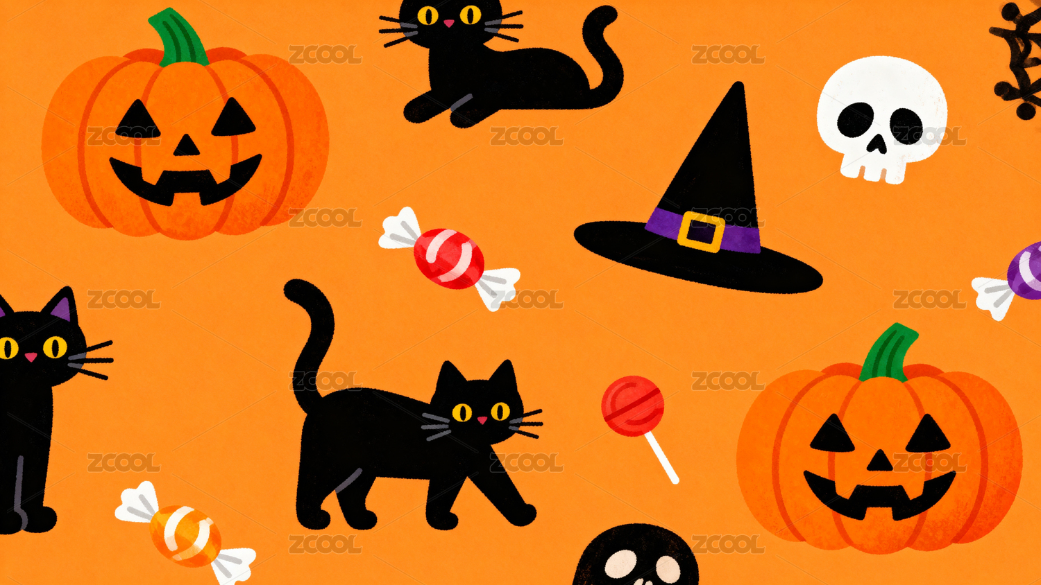 南瓜,黑猫,橙色,节日,可爱,卡通,万圣节,黑色,夜晚,骷髅