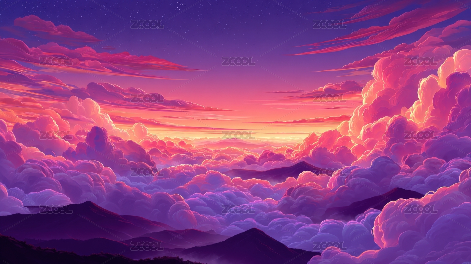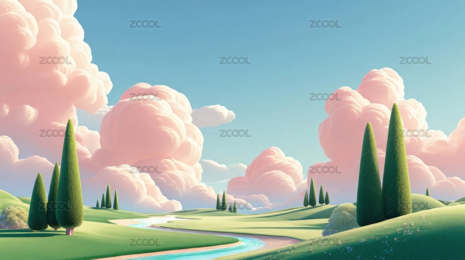 云朵,天空,粉色,梦幻,风景,田园,草地,自然,插画,背景