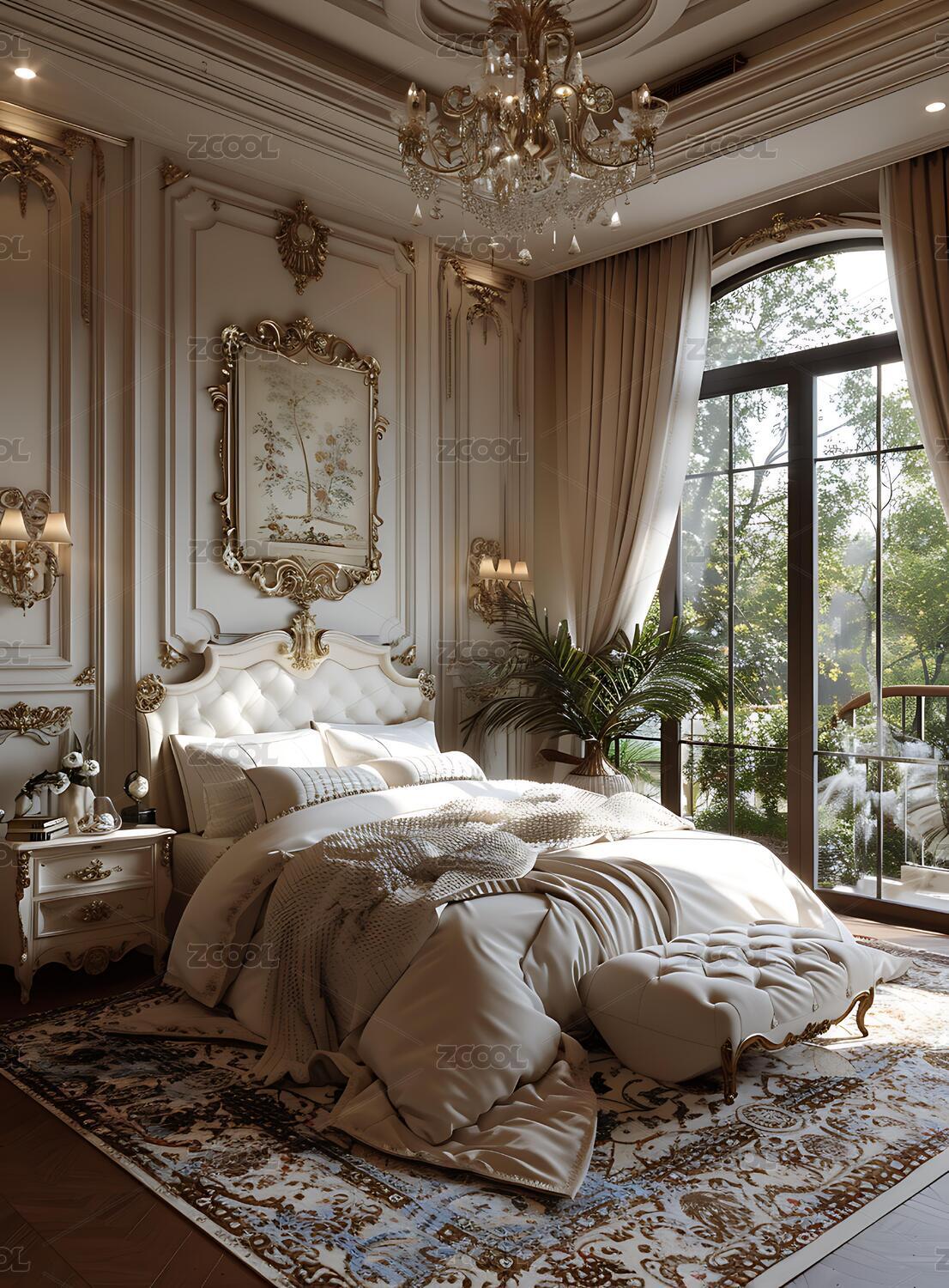 吊灯,窗帘,卧室,床头,沙发,落地窗,壁灯,地毯,地板,软装