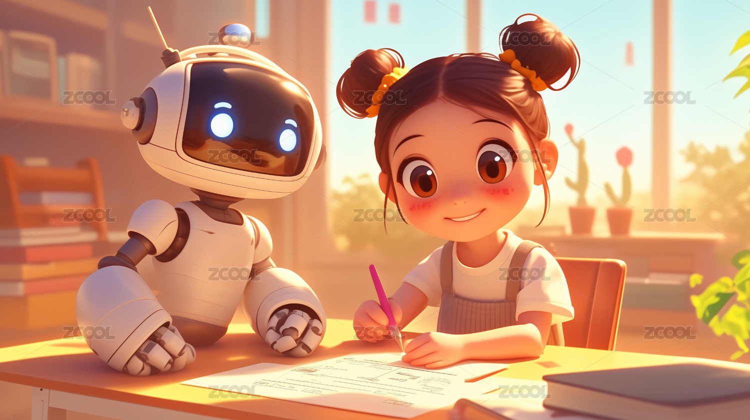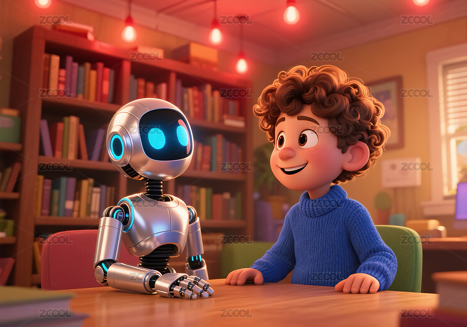 小男孩,机器人,习题本,教室,黑板,彩笔,书本,卡通,教育,互动